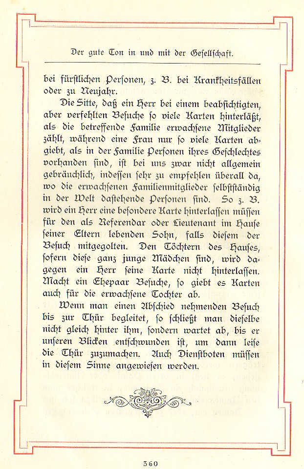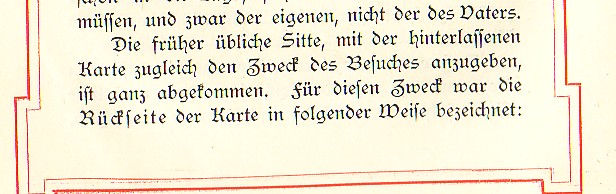 In meinem Buch „Der gute Ton in allen Lebenslagen – Ein Handbuch für den Verkehr in der Familie, in der Gesellschaft und im öffentlichen Leben“ von Franz Ebhardt, Berlin 1882 findet sich neben zahllosen Regeln zum geglückten Empfang über die Unschicklichkeit des Zigarre-Rauchens von Damen in der Öffentlichkeit bis hin zum Verhalten in der Kirche auch die folgende Anleitung zum Gebrauch der Visitenkarte: