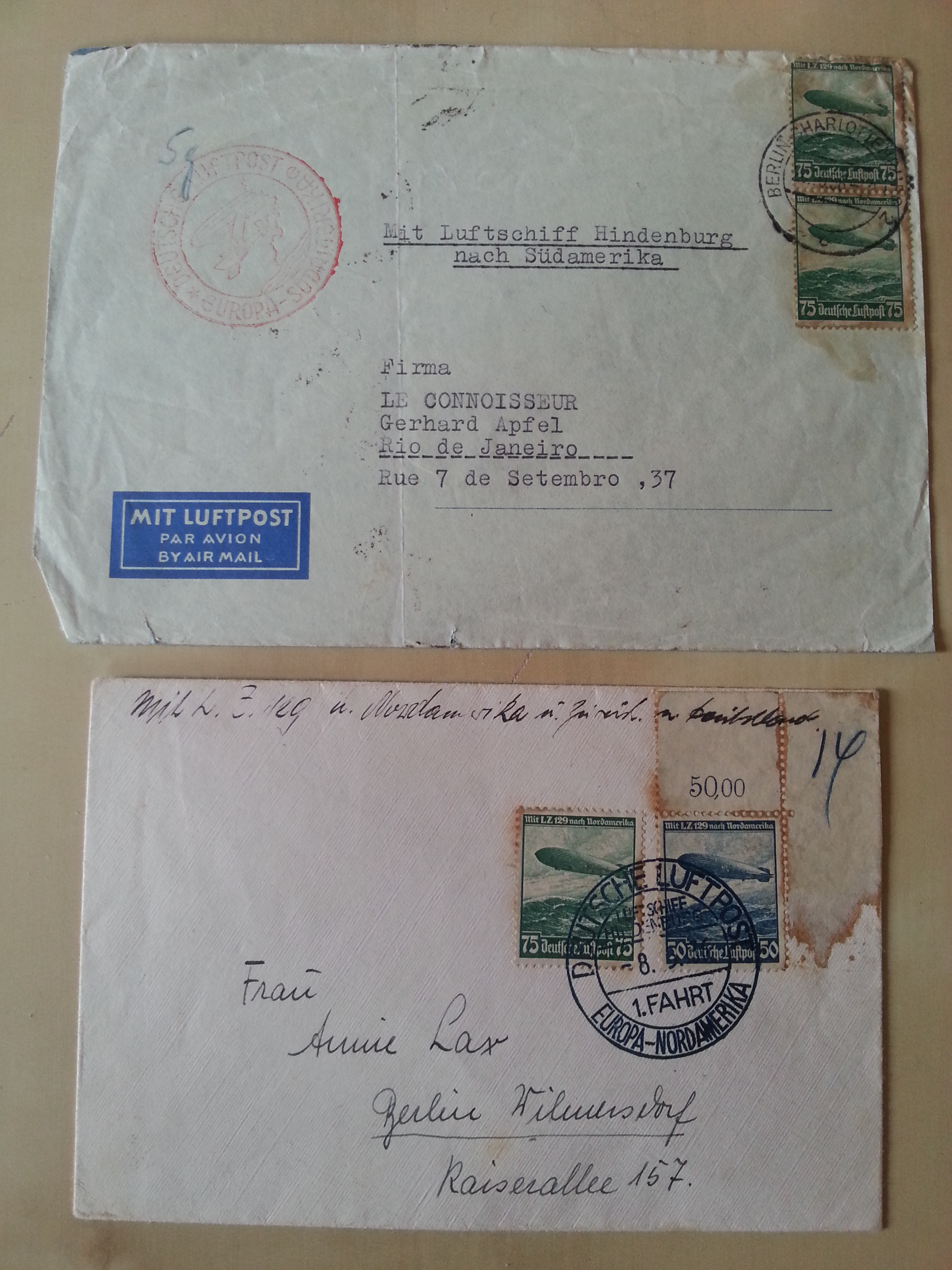 Der obere Brief ist von einer Südamerika-Fahrt – abgeschickt in Berlin am 21.10.1936, angekommen in Rio de Janeiro am 25.10.1936. (Update: Danke für die Nachfrage von „Hurz“. Das hat mich zu mehr Nachforschungen ermuntert. Ergebnis: Dieser Brief stammt von der längsten je zurückgelegten Fahrt des LZ129. siehe hier)