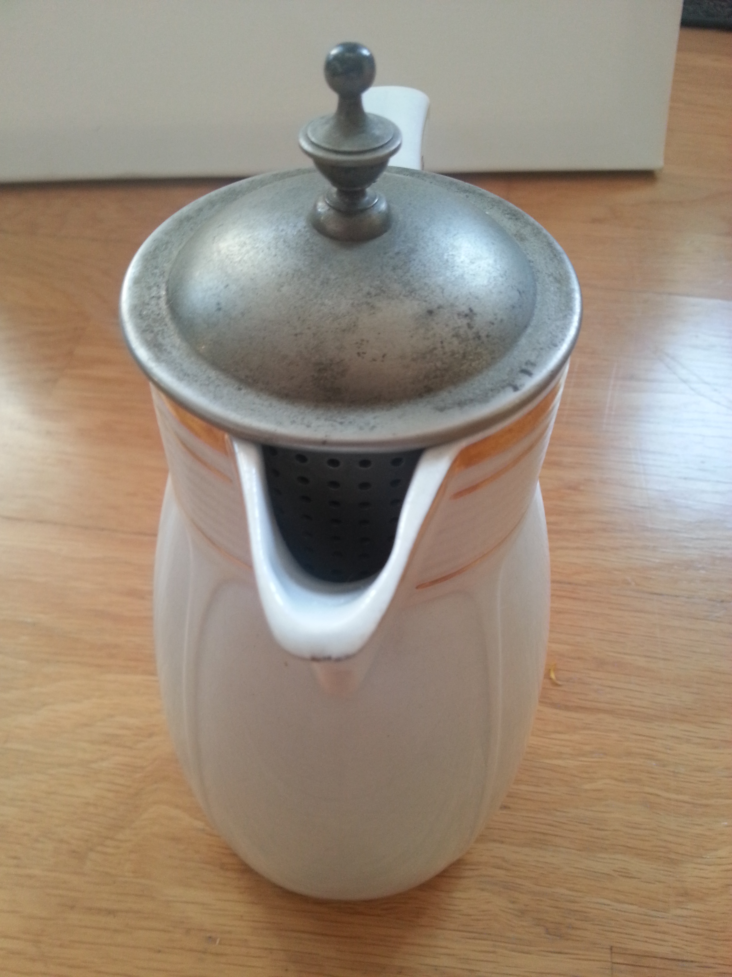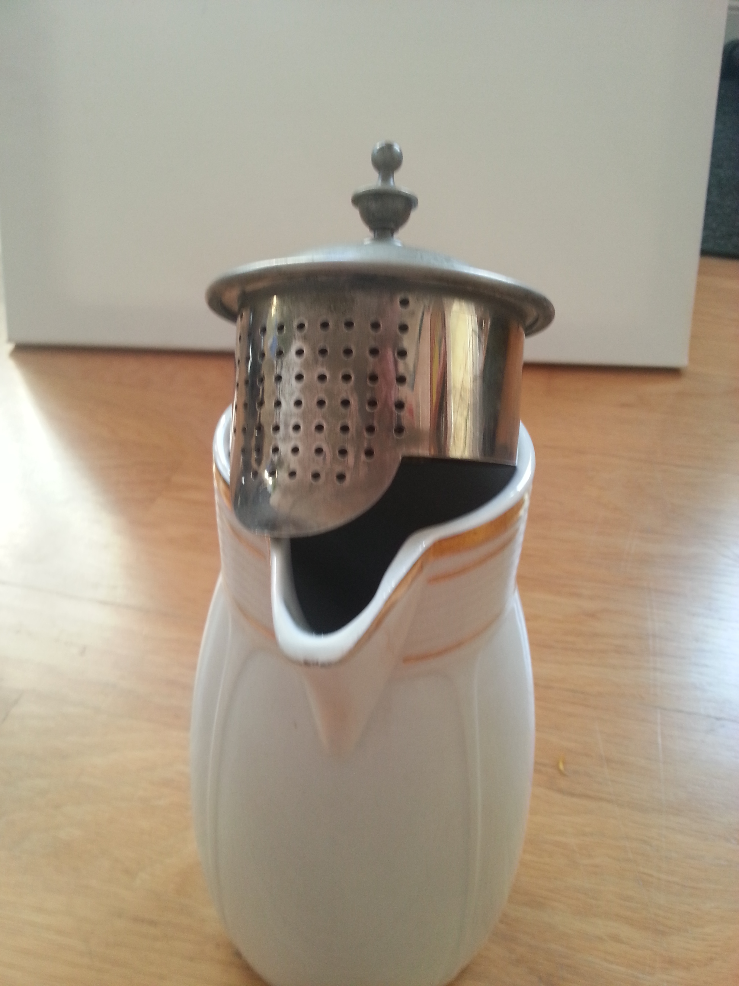 Wenn, ja, wenn da nicht die widerliche Haut auf der Milch wäre. Da die meisten Menschen (außer meiner Mutter) diese Haut eklig finden, hat ein kluger Kopf diese tolle Kanne erfunden. Das Design läßt mich auf ca. 1920 schließen.