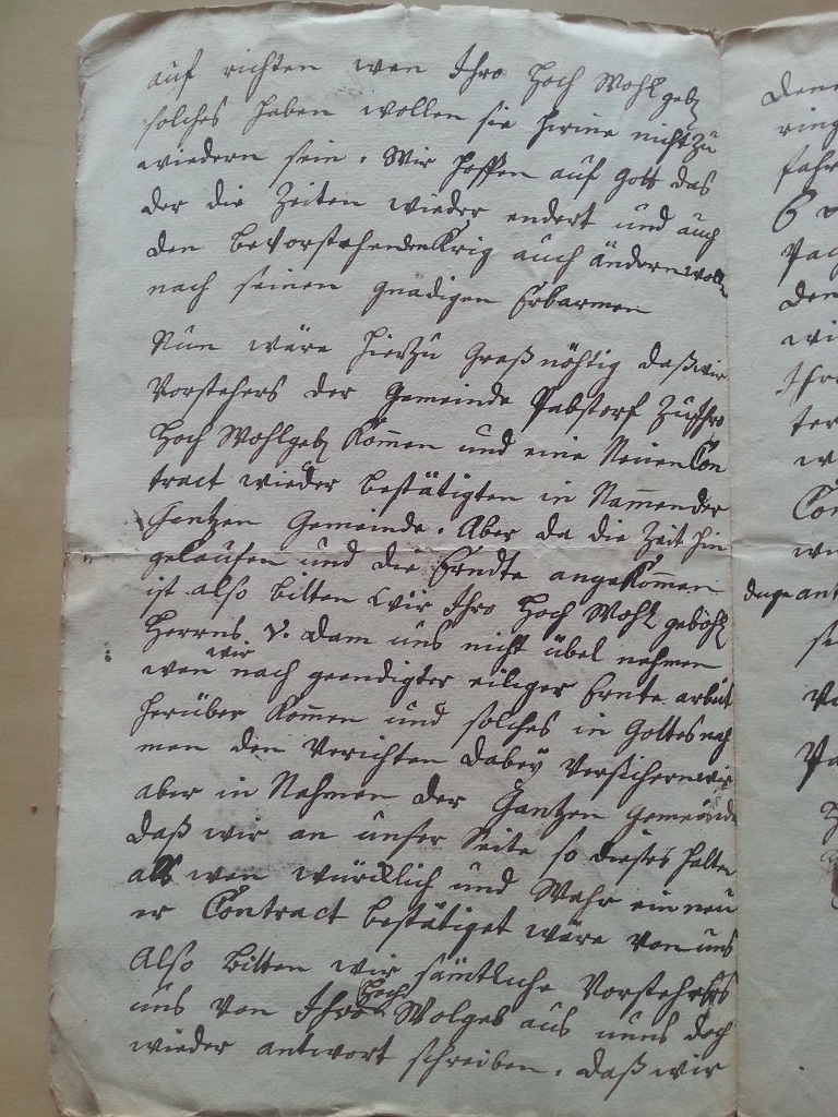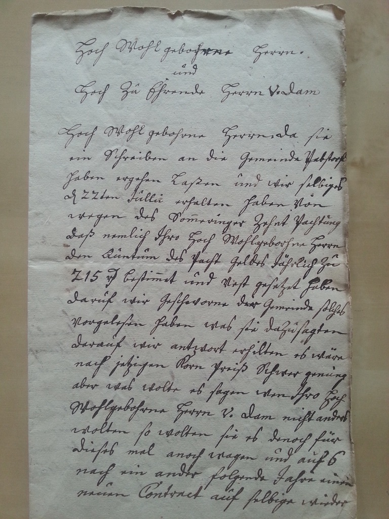 Hoch Wohlgeborne Herrn, da sie ein Schreiben an die Gemeinde Pabstorf haben ergehen laßen und wir selbiges am 22ten Julli erhalten haben von wegen des Someringer Zehnt Pachtung daß nemlich Ihro Hoch Wohlgeborhne Herrn den Qu(a)ntum (?) des Pacht Geldes jährlich zu 215 Thaler bestimmt und fest gesetzet haben dar(a)uf wir Geschworne der Gemeinde solches vorgelesen haben was sie dazu sagten darauf wir antwort erhilten es wäre nach jetzigen Korn Preiß Schwer genug aber was wolte es sagen wen Ihro Hoch Wohlgeborne Herrn v. Dam(m) nicht anders wol(l)ten so wol(l)ten sie es den(n)och für dieses mal anoch wagen und auf 6 nach ein ander folgende Jahre einen neuen Contract auf selbige wieder