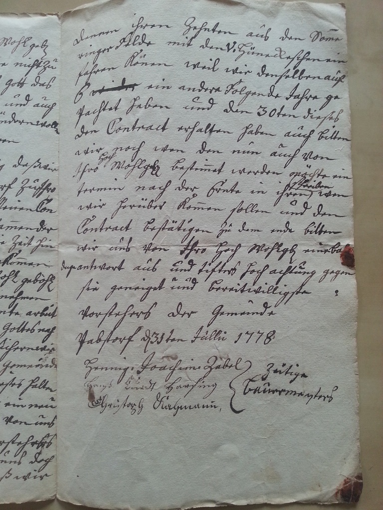 dennen iheren Zehnten aus den Someringer Felde mit den v. Günneckeschen einfahren kön(n)en weil wir denselben auf 6 ein ander folgende Jahre gepachtet haben und den 30ten dieses den Contract erhalten haben auch bitten wir noch wan den nun auch von Ihro Hoch Wohlgeb bestimt werden möchte ein termin nach der Ernte in ihren Schreiben wan wir herüber komen sollen und den Contract bestätigen zu dem ende bitten wir uns von Ihro Hoch Wohlgeb eine baldige antwort aus und ___________ Hochachtung gegen Sie geneiget und bereit willigste Vorstehers der Gemeinde Pabstorf d 31ten Julli 1778