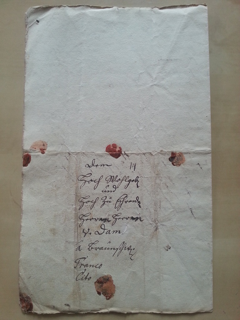 Anschrift auf dem Briefumschlag: Dem Hoch Wohlgeb und Hoch zu Ehrend Herren Herren (ja, es steht hier doppelt). Dam á Braunschweig – Franco Cito (ihr seht am Ende von „Wohlgeb“ und „Ehrend“ eine kleine Linie nach unten – sie bedeutet jeweils eine Wortendung, die eh bekannt ist „wohlgeborener“ „ehrender“ usw.)