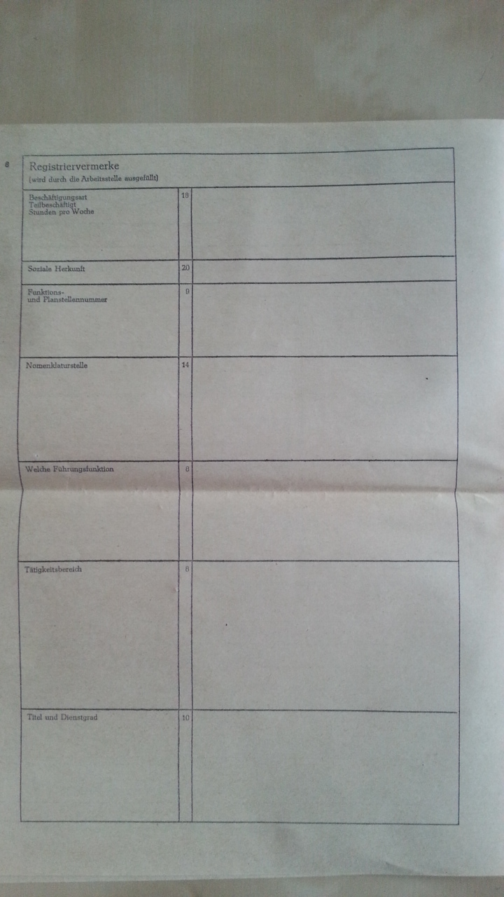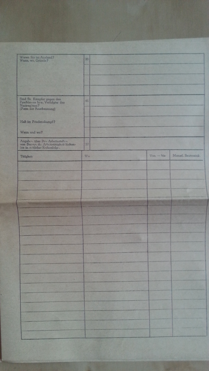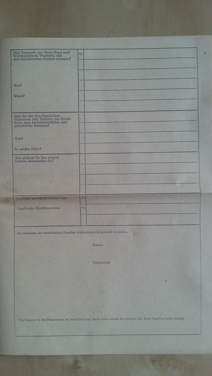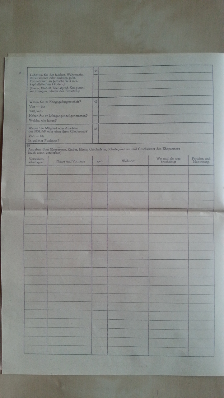 - Gehörten Sie der faschistischen Wehrmacht, Arbeitsdienst oder anderen militärischen Formationen an (einschließlich WD u.a. kapitalistischen Ländern (WD = West-Deutschland)