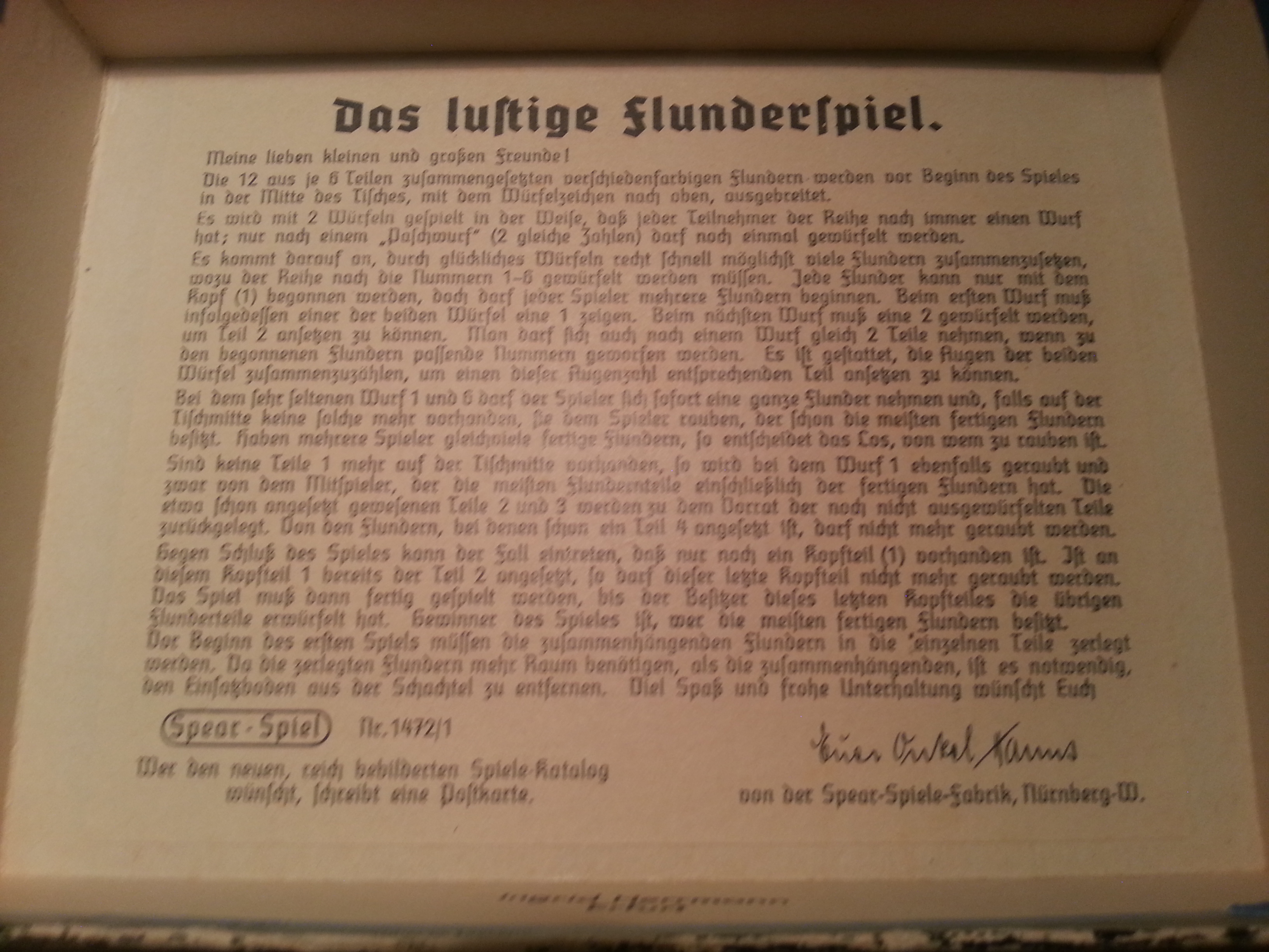 Da also „Onkel Hanns“ die Firma Spear-Spiele 1938 übernommen hatte, ab Sept. 1941 kein Sütterlin mehr gestattet war, gehe ich davon aus, daß das Spiel irgendwann in diesem engen Zeitrahmen hergestellt wurde.