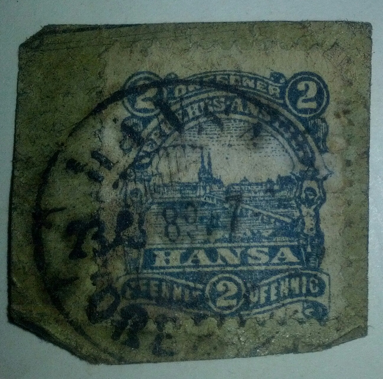 Die nächste Marke stammt aus Dresden und wurde am 23. März 1889 abgestempelt. Die Dresdner Verkehrs-Anstalt HANSA existierte von Dezember 1886 bis zur Übernahme durch die Reichspost am 31. März 1900. Im vergleich zu den drei Berliner Marken für 10, 30 und 50 Pfennige, haben alle weiteren Marken nur Nennwerte von 2 oder 3 Pfennigen. Ich vermute, daß die teuren Preise mit dem Expressverkehr begründet sind, während die preiswerten Briefe auf herkömmliche Art befördert wurden.