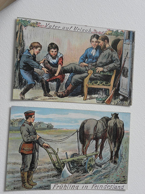 1. Ein Verwandter von mir hat gerade die Post meines Urgroßvaters aus dem ersten Weltkrieg in einem Buch zusammengetragen. Die darin abgedruckten Postkarten sind nicht so kunstvoll wie diese hier, aber andauernd wird der Stolz darauf gepriesen, für Volk und Vaterland in den Krieg zu ziehen. Es ist wirklich verstörend.