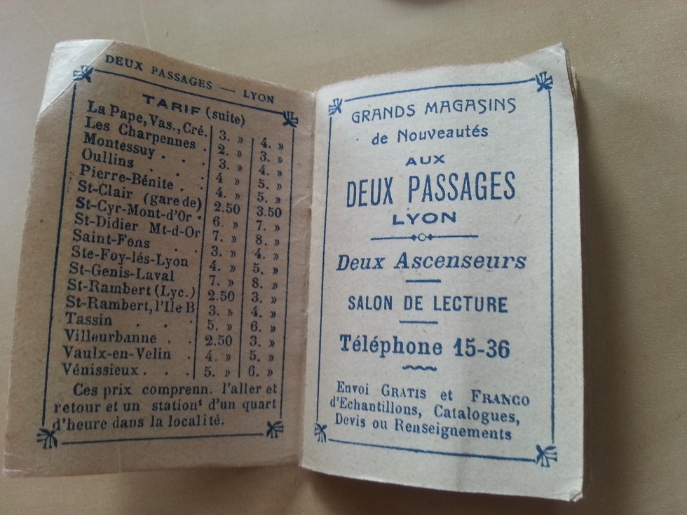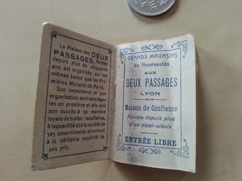 Hier habe ich ein besonders kleines Exemplar des Kaufhauses „Aux Deux Passages“ in Lyon aus dem Jahr 1909, das zu Werbezwecken an die geschätzte Kundschaft verteilt wurde.