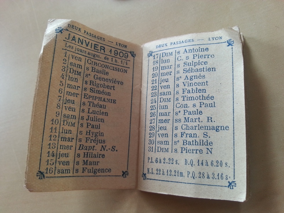 Neben dem Kalender gab es Angaben zum Taxi-Preis (oder waren es noch Kutschen?). Innenstadt Lyon, 2 Personen zwischen 6 Uhr morgens und Mitternacht, pro Fahrt 1,50 Franc; pro Stunde 2 Franc, zwischen Mitternacht und 6 Uhr 2F bzw. 2,50F, für 4 Personen entsprechend mehr. Auf der rechten Seite sind die Preise für Fahrten ins Umland angegeben.