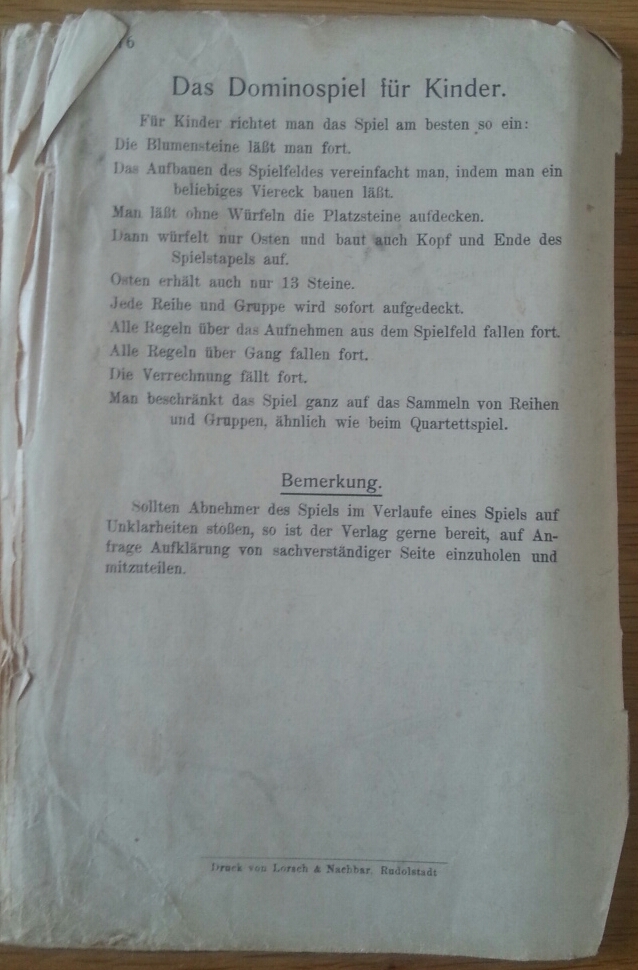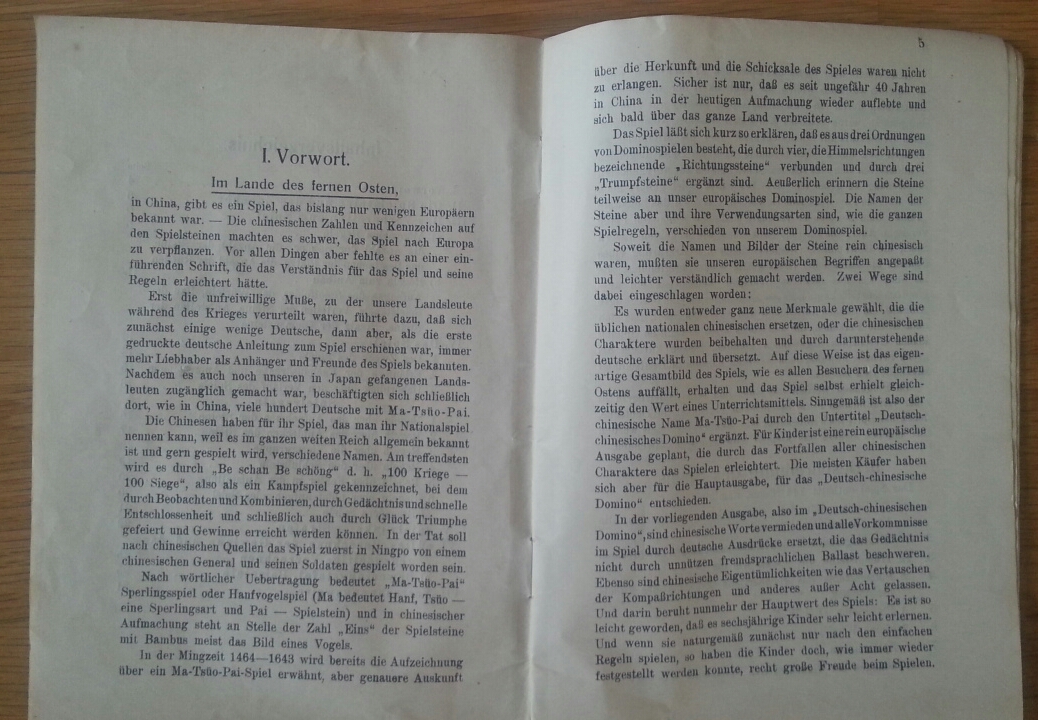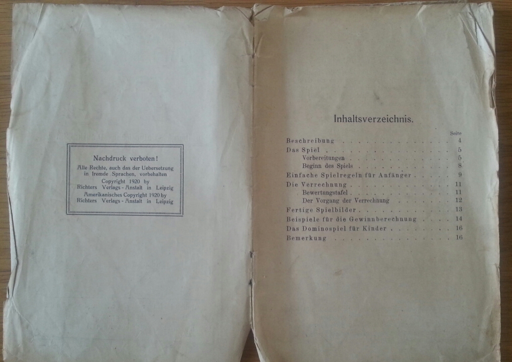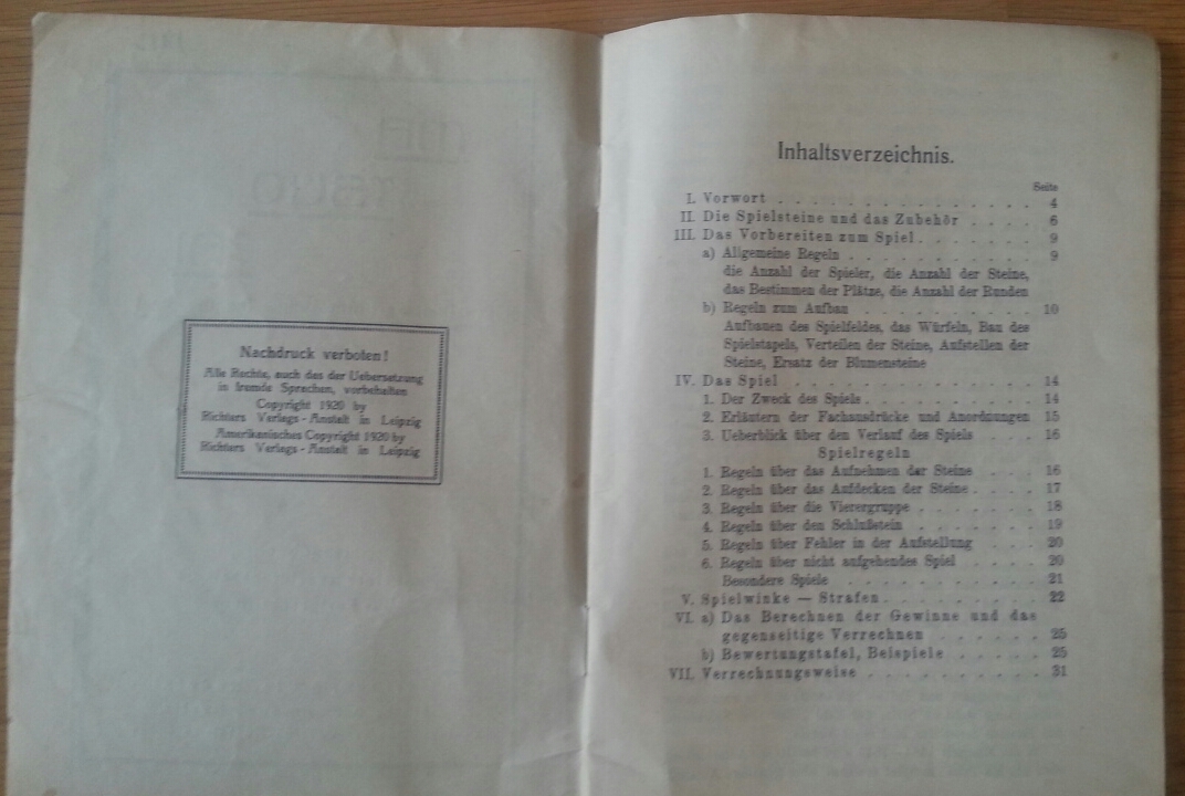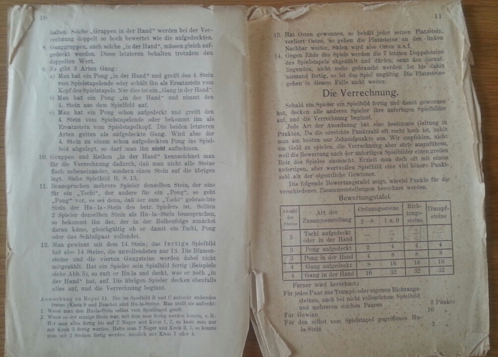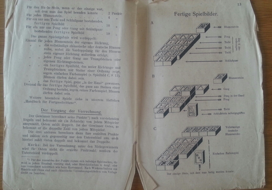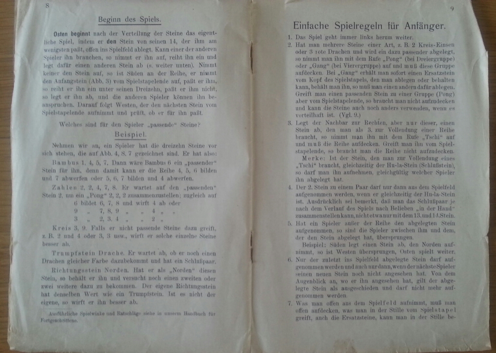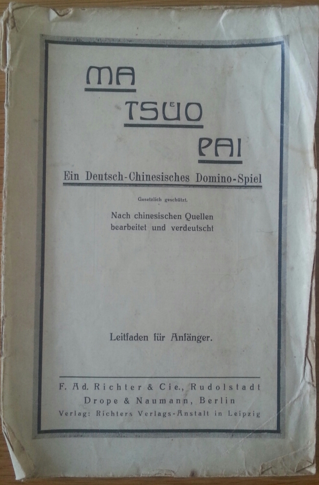 Ab 1924 hieß das Spiel auch in Deutschland patentgeschützt Mah-Jongg. Dieses hier von 1920 hatte noch den alten in Deutschland gebrauchten Namen Ma-Tsüo-Pai.
