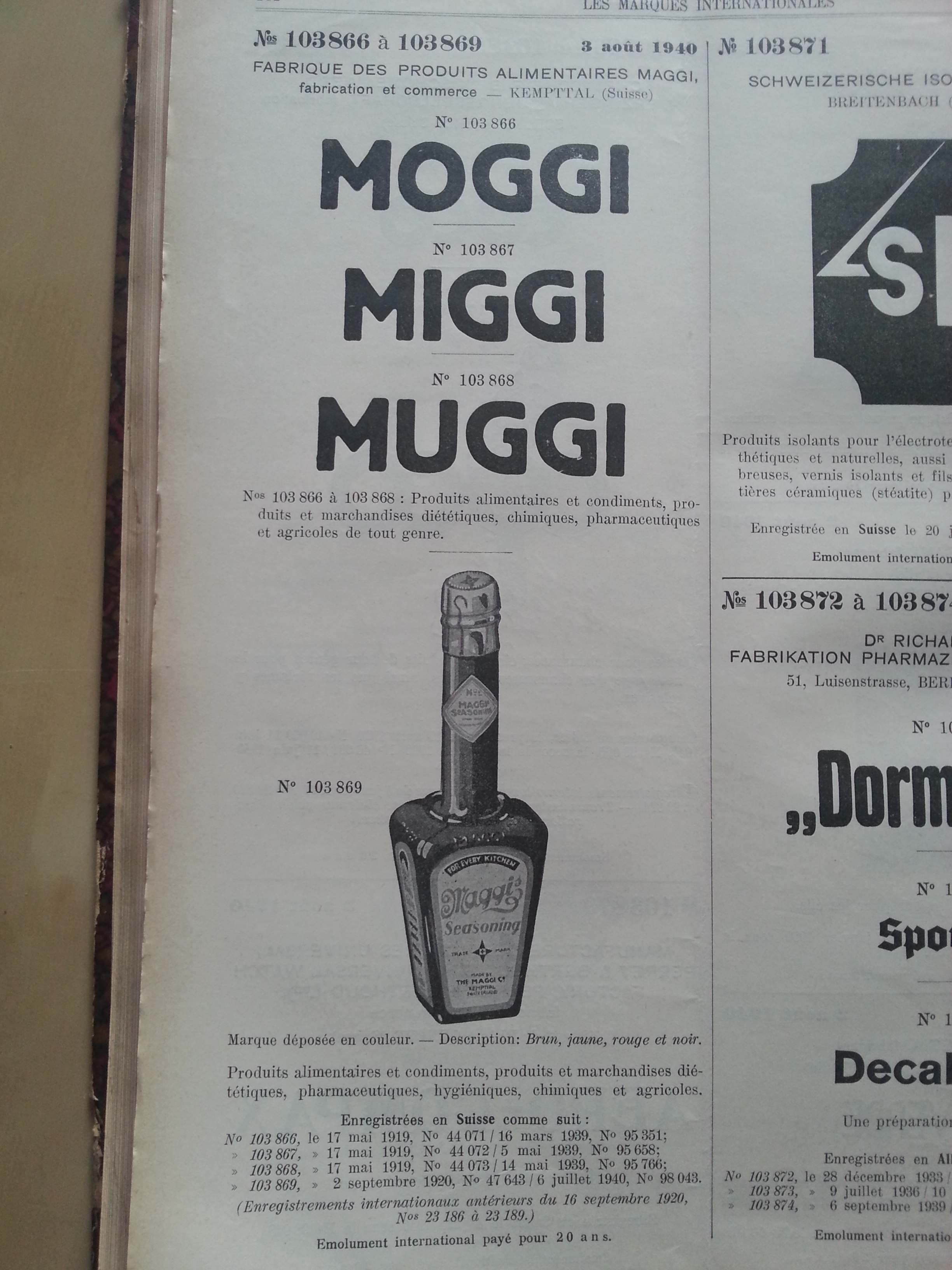 Und schließlich der Namensgeber dieses Artikels. Um sich vor ähnlich klingenden Artikeln zu schützen, hat man sich die Namen am 9. August 1940 vorsorglich selbst gesichert. Moggi, Miggi und Muggi wird es also ohne Zustimmung von Maggi, die seit 1947 zum Nestlé-Konzern gehört, nicht geben. Die Flaschenform wurde bei der Gelegenheit auch nochmals für weitere 20 Jahre geschützt.