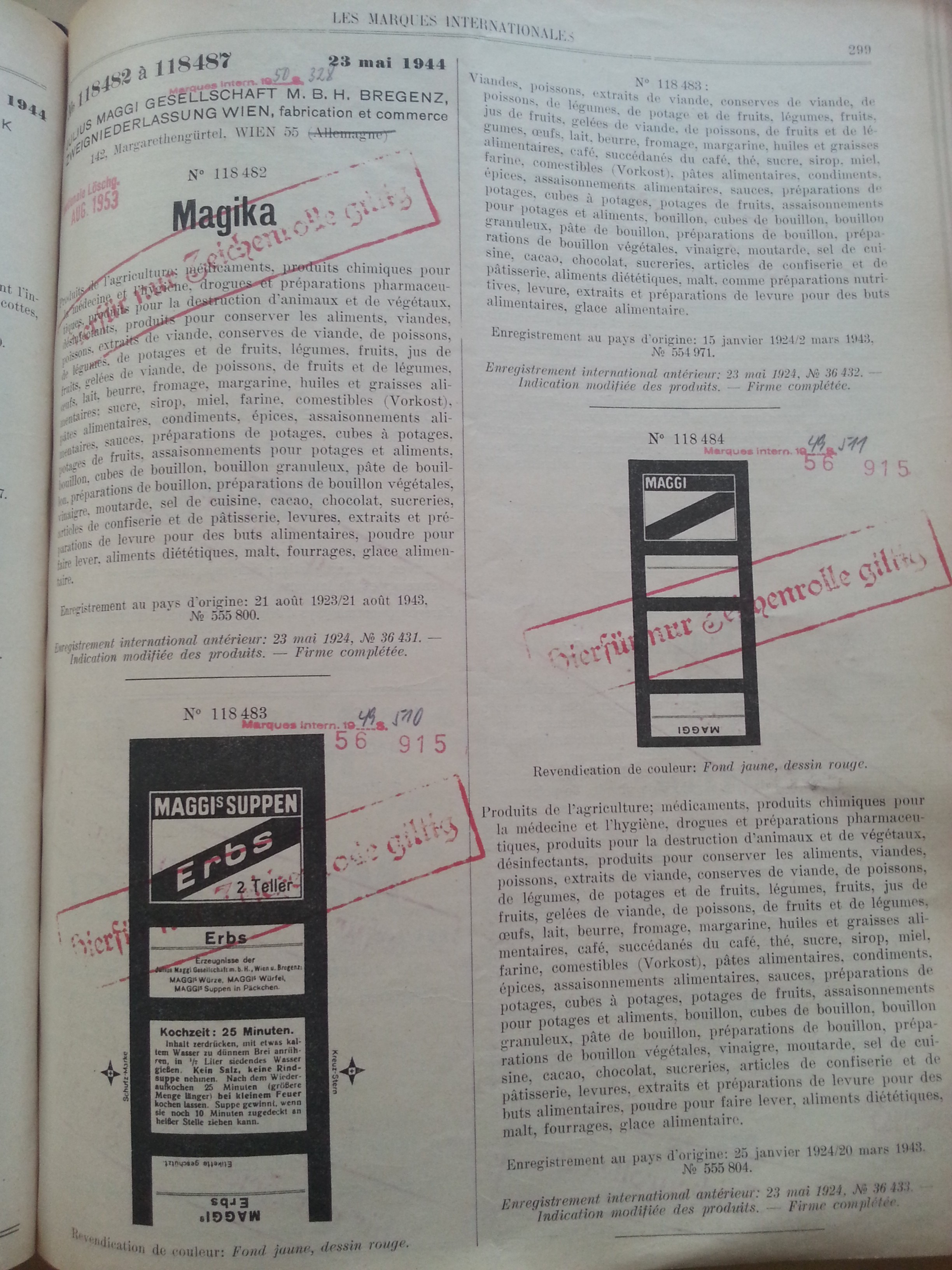 Da Maggi, wie jede andere Firma auch, ein besonderes Interesse hatte, sich vor Nachahmungen und Fälschungen zu schützen, haben sie sämtliche neuen Produkte und Verpackungen schützen lassen. Hier ein Paar Auszüge aus den Patentbüchern. (ich habe die von 1935, 1940 und 1944)