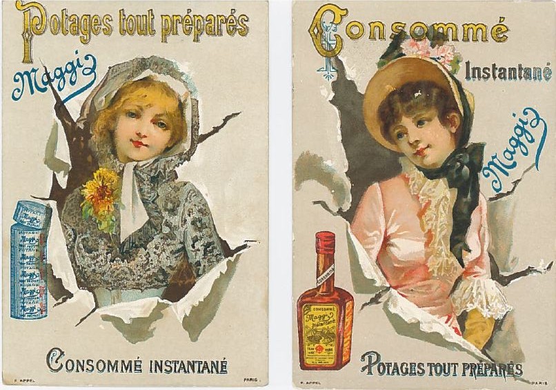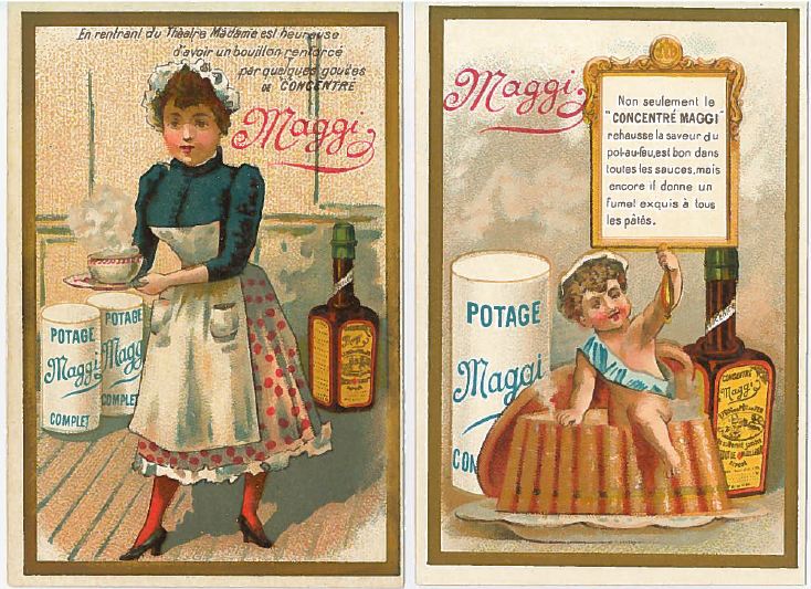 Der ungekrönte König der Brühwürfel ist wohl der Maggi-Brühwürfel. Die 1869 beginnende Geschichte der Firma Julius Maggi erlebte viele Höhepunkte von denen die Maggi-Würze im braunen Fläschchen wohl das größte Highlight darstellt. Heute ist es oben etwas runder als früher, aber die Form ist in etwa gleich geblieben. Diese Sammelkarten von ca. 1887 illustrieren das ganz gut. Links eine Art Brühwürfel – damals noch in runder Tablettenform, rechts das Fläschchen.