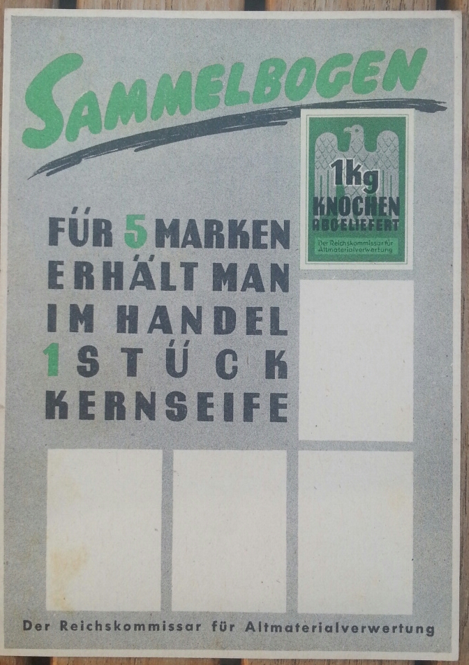 Den folgenden Sammelbogen erhielt, wer 1 kg Tierknochen zur Sammelstelle der Altmaterialverwertung brachte. Für jedes weitere Kilogramm gab es eine Marke, die in die entsprechenden Felder eingeklebt wurde. Wer ein halbes Kilogramm ablieferte, erhielt eine Marke halber Größe.