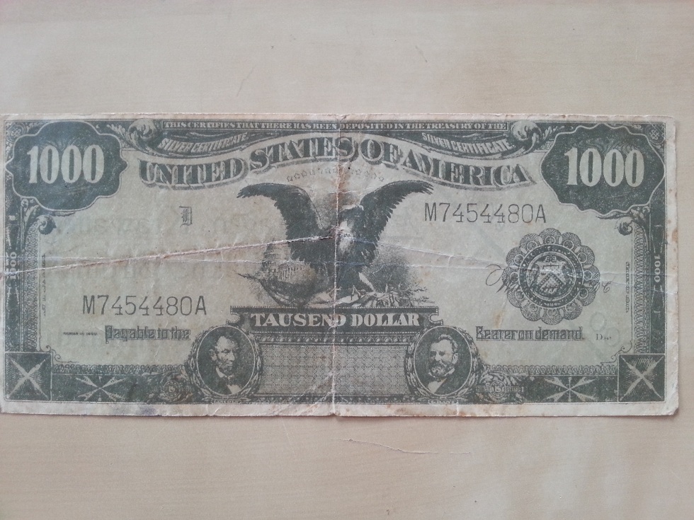 Dieser 1000-Dollar-Schein sieht den Originalen von 1918, 1934 und der Gold-Ausgabe nur bedingt ähnlich. Für das deutsche Auge der 1920er / 1930er-Jahre hat es aber ausgereicht. Auch die deutsche Aufschrift „Tausend Dollar“ klingt sehr unamerikanisch.