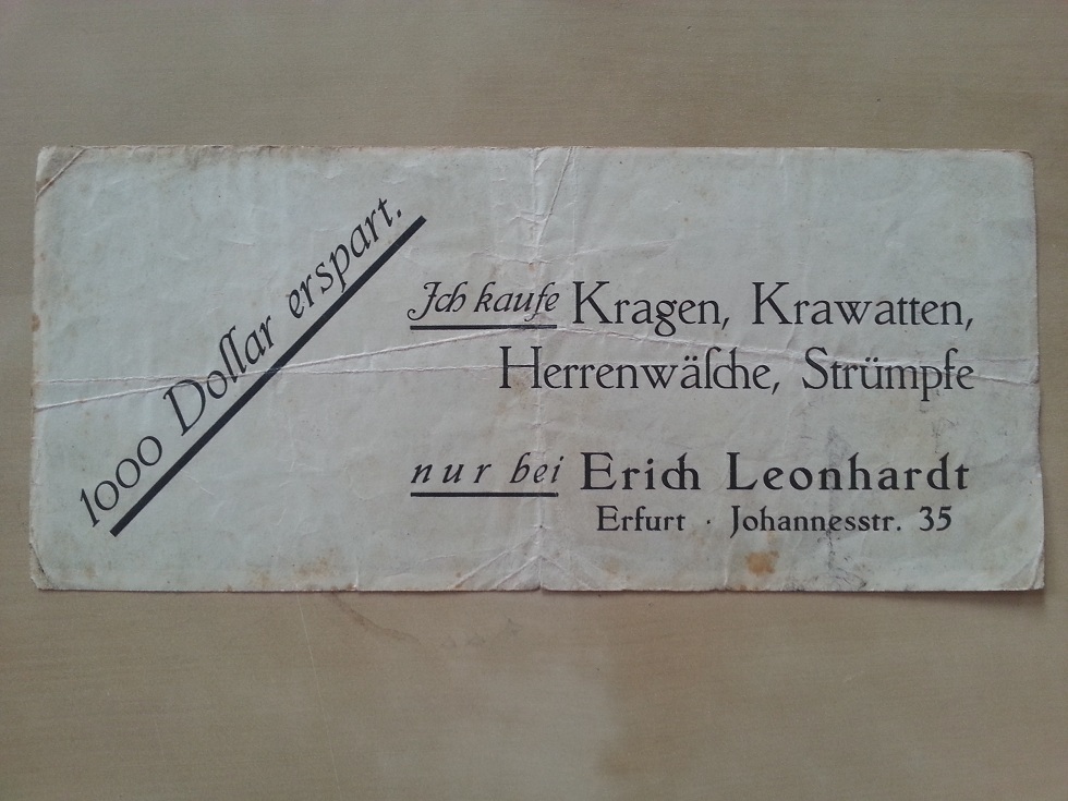 - Entweder fiel die Werbung in die Zeit der bereits besprochenen Inflation, wo die heute versprochenen 1000 Mark morgen nicht einmal zum Kauf eines Hosenknopfes ausreichten. In dieser Zeit war der Dollar eine sichere Währung.