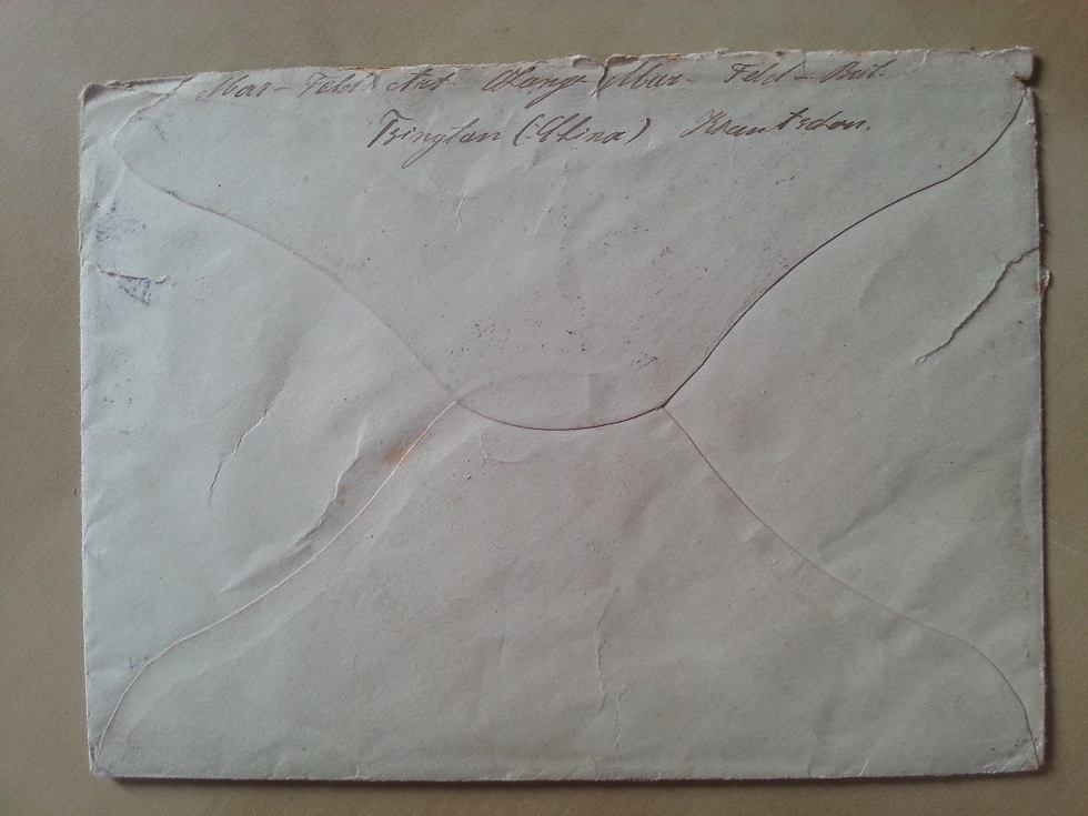 Mein Ur-Groß-Onkel (großmütterlicherseits) – also der Bruder meines Ur-Opas – hat es sich jedoch nicht nehmen lassen, 1910 in Tsingtau im Mar-Feld-Bat (Marine-Feld-Batallion) als Mar-Feld-Art (Artillerist?) zu dienen und seinem Bruder einen Brief zu senden.