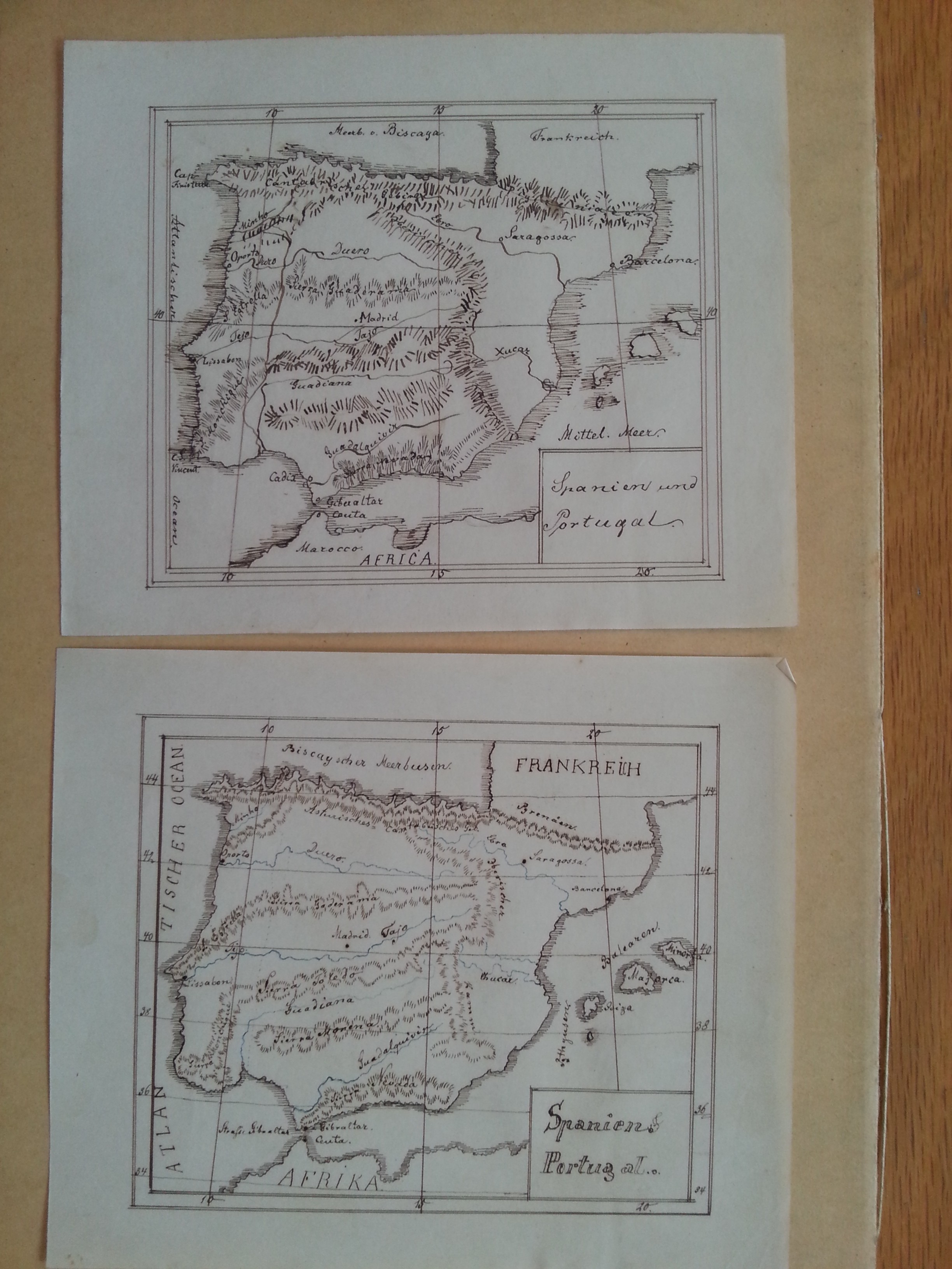Zwei Versuche Spanien & Portugal bei denen man gut sieht, daß es nicht durchgezeichnet sein kann, da sich z.B. der Fluss Ebro (Mitte rechts) auf den beiden Karten in seinem Lauf stark unterscheidet