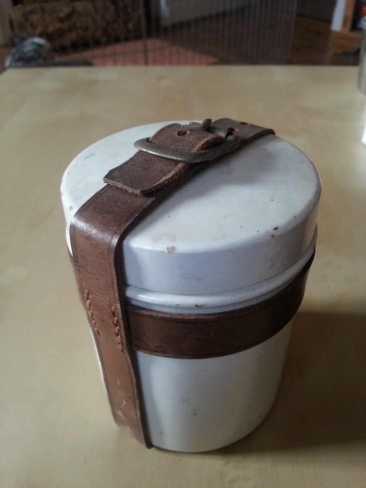Interessanter, weil hübscher ist dieses Gefäß. Ein ca. 15 cm hoher Keramiktopf mit Deckel. Damit der Deckel (relativ) dicht verschlossen bleibt und beim Transport nicht abfällt, ist das gesamte Gefäß mit Leder-Riemen umfaßt. Oben gibt es eine Schnalle, die seltsamerweise mehrere Löcher hat, was mir unsinnig erscheint, da der Deckel nur auf eine Art aufgesetzt werden kann.