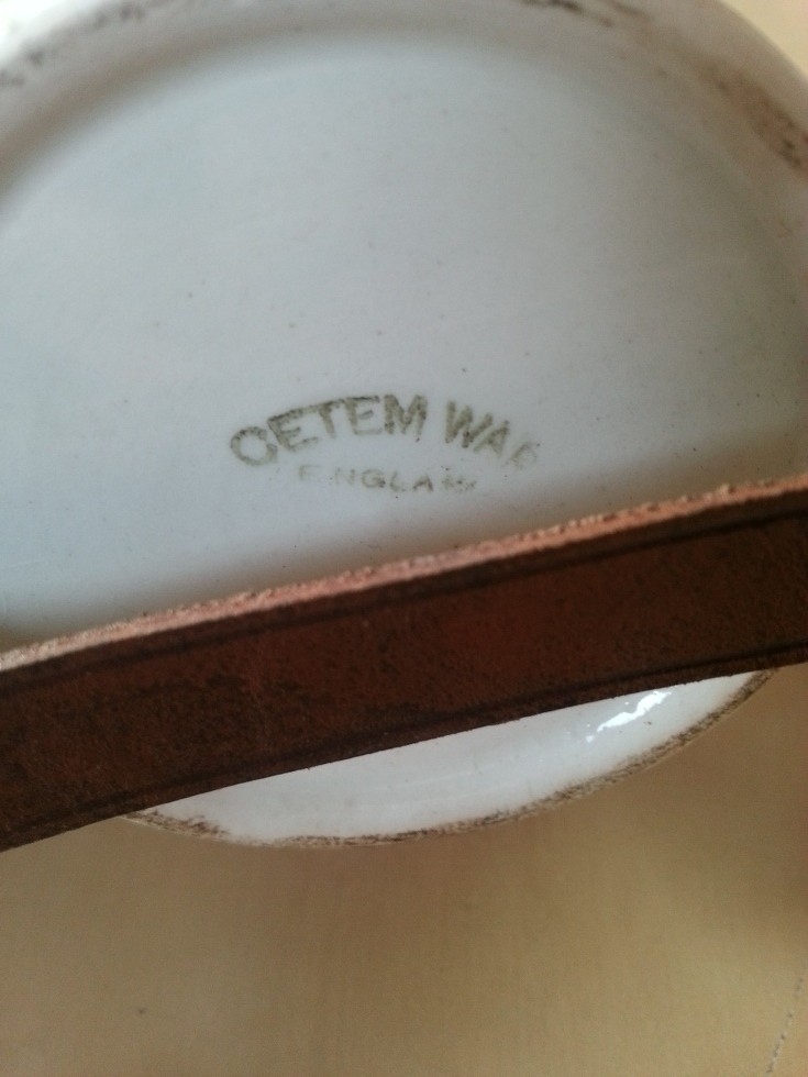 Dieser Topf stammt aus England. Ich besitze weitere solche Keramiktöpfe, die auf die Zeit zwischen 1900 und 1920 datiert werden. Daher vermute ich auch für diesen lederumgürteten Kameraden diese Ära. Der Aufdruck „CETEM WARE“ hat mich noch nicht sehr viel weiter gebracht. Es handelt sich hier offenbar um eine in England sehr erfolgreiche Gebrauchsgeschirr-Art.