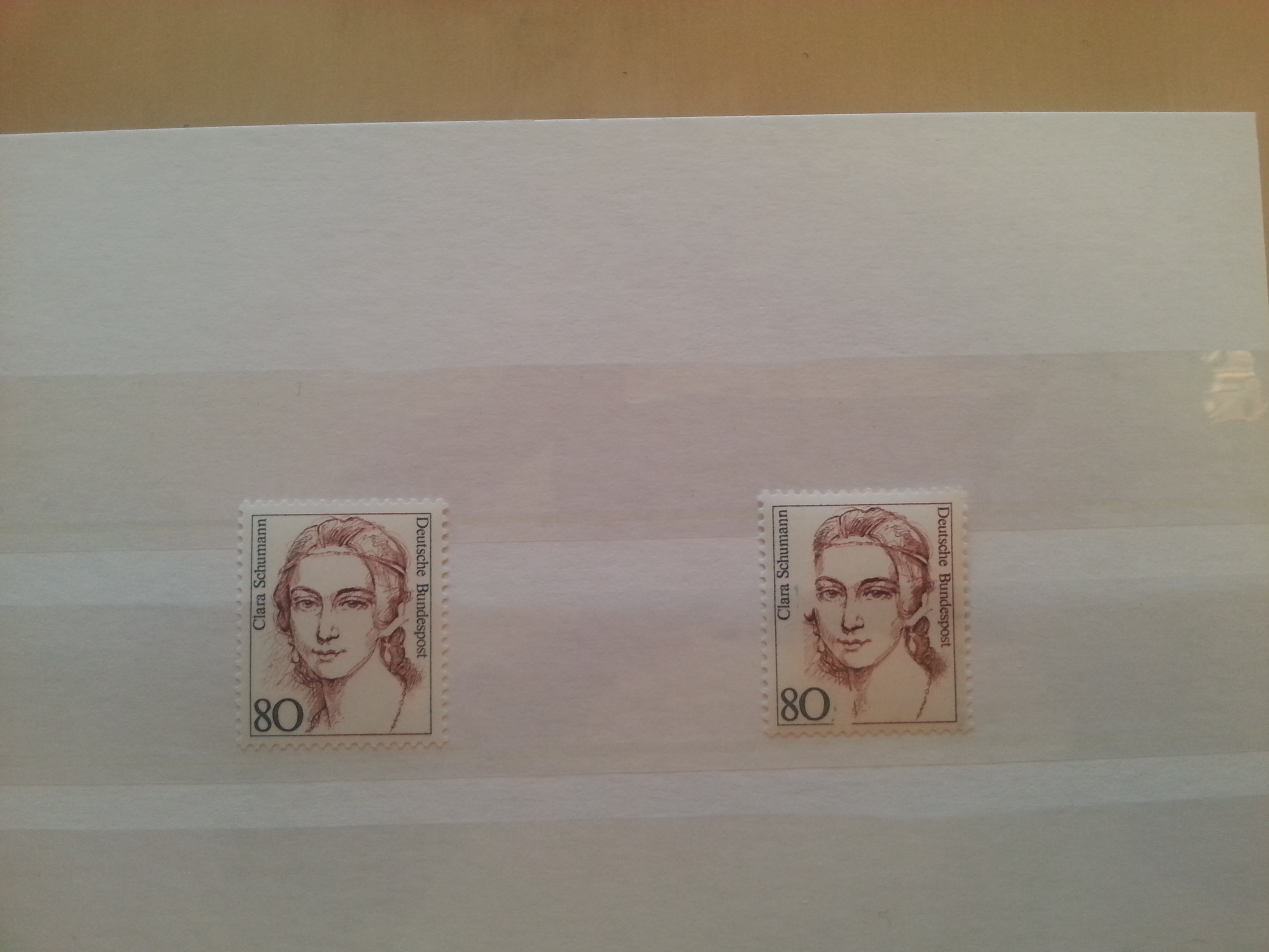 links seht ihr die fehlerfreie Marke – rechts fehlt ein Teil der Farbe am Kopf (oben links)