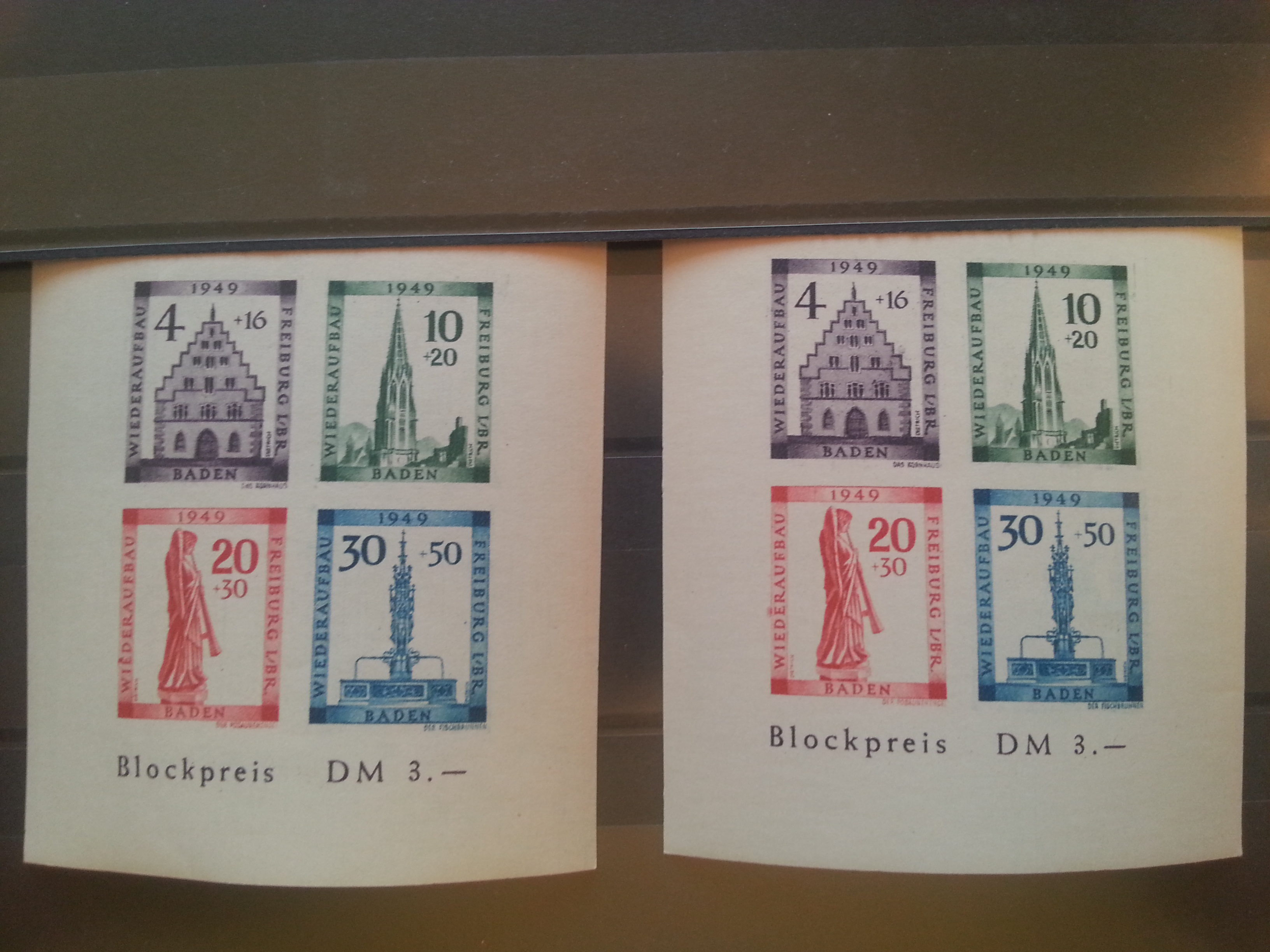 hier seht ihr zwei unterschiedliche Fehldrucke des gleichen Blockes. Die Farb-Unreinheiten befinden sich am linken Rand der roten Marke. Man kann es sogar in dieser Ansicht erkennen, besser seht ihr es, wenn ihr auf das Bild klickt. Über den ‚E’s von „Wiederaufbau“ befindet sich jeweils ein Farbfehler, der aus jedem der Blöcke gleich ein 300-Euro-Sammelstück macht.