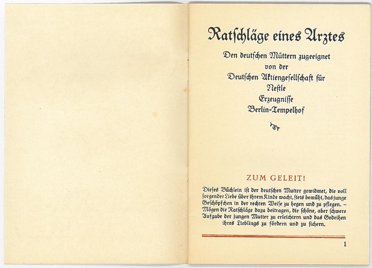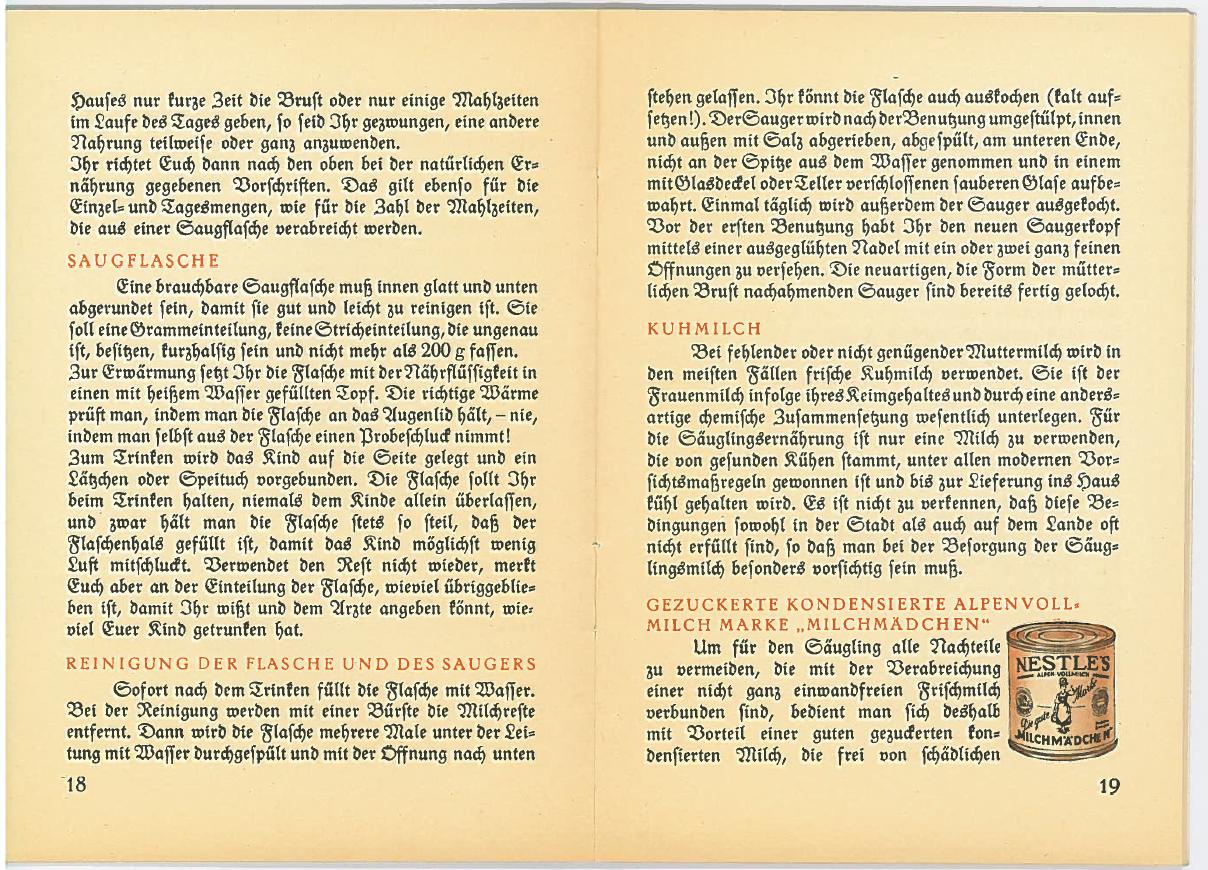 „Gesunde Kinder, glückliche Mütter!“ lautet der Titel dieses Leitfadens für die gewordene Mutter. Im weiteren Sinne handelt es sich dabei um eine Art Werbebroschüre für Nestlé-Artikel, die allerdings wertvolle Hinweise zum Wechseln der Windeln und dem bequemen bereiten des Babybetts enthält.