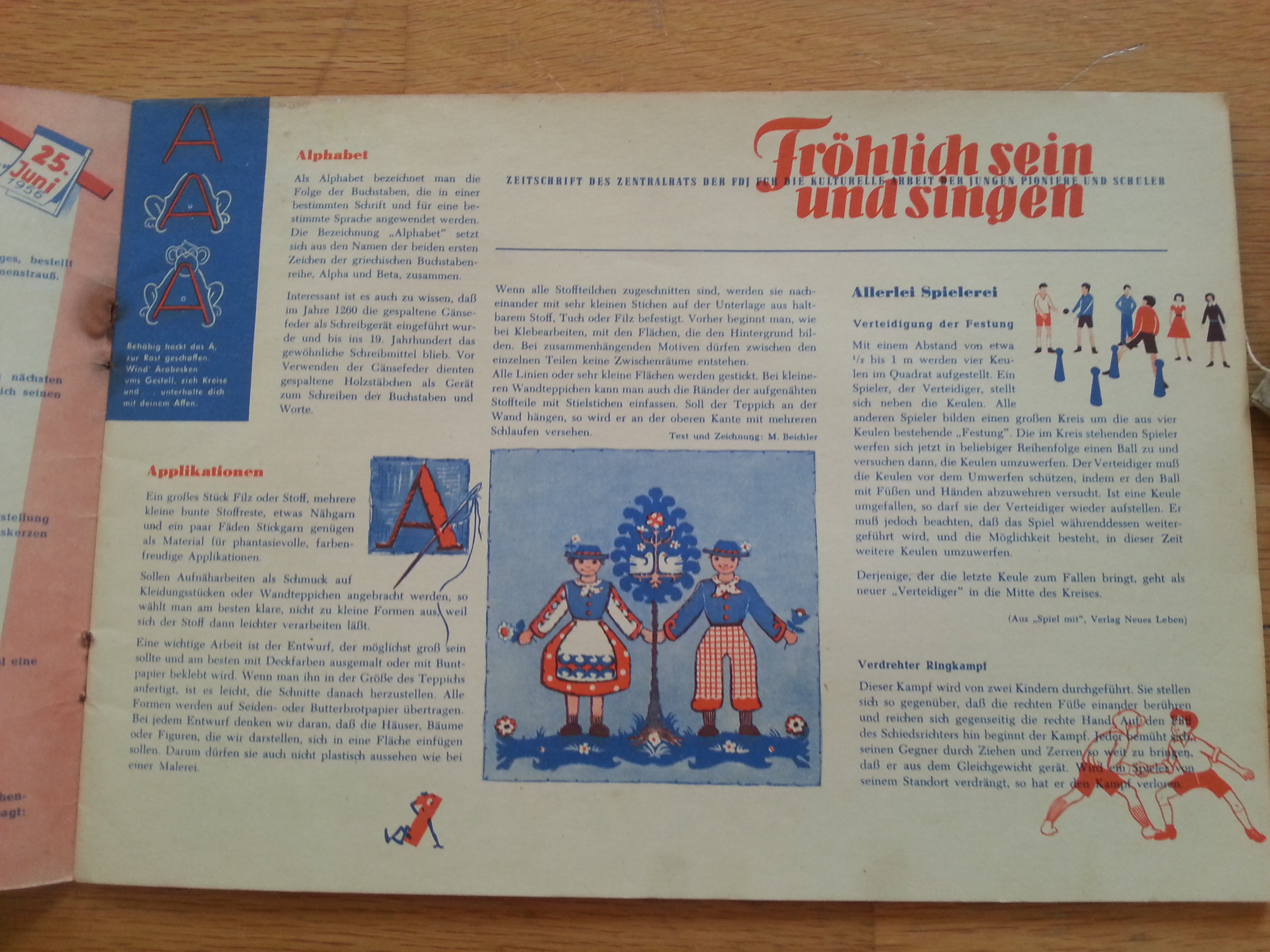 Gestern habe ich euch die frühen FröSis vorgestellt. Hochformat und alle sechs Wochen erscheinend. Heute geht es weiter mit dem Jahr 1956. Ich vermute, die Papierknappheit der frühen 1950er Jahre war überwunden und man hatte genug Papier um statt zwei Ausgaben in drei Monaten nun ein Heft pro Monat erscheinen zu lassen. Mit einher kam der Formatwechsel von A4 hochkant zum Querformat. Daß das nicht immer vorteilhaft war, sieht man an der ersten Ausgabe Heft 5 / 1956, bei der das Cover abgerissen ist. Hochformatige Zeitschriften lassen sich einfach besser lesen.