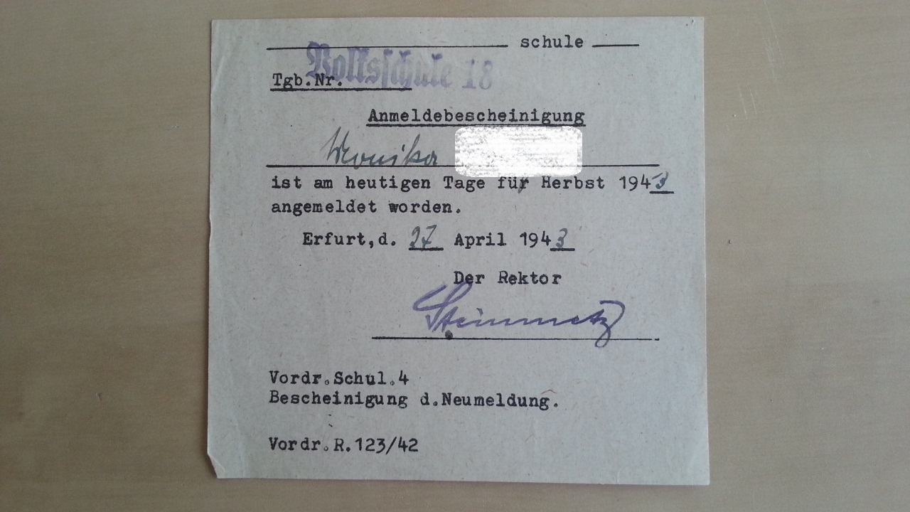 1943 kam man auch schon zur Schule. Nicht ich, sondern meine Tante. Ich erinnere an vergangene Artikel in diesem Museum. Die Mutter war mit den drei Kindern allein, der Vater war an der Front bzw. bereits am 27.2.1942 für Führer und Vaterland gefallen. Nun kam die Älteste in die Schule und noch niemand wusste, daß sie gemeinsam auf’s Land evakuiert wurden um Bombenangriffen aus dem Weg zu gehen und daß das Haus in dem sie wohnten 1945 noch weggebombt wurde.