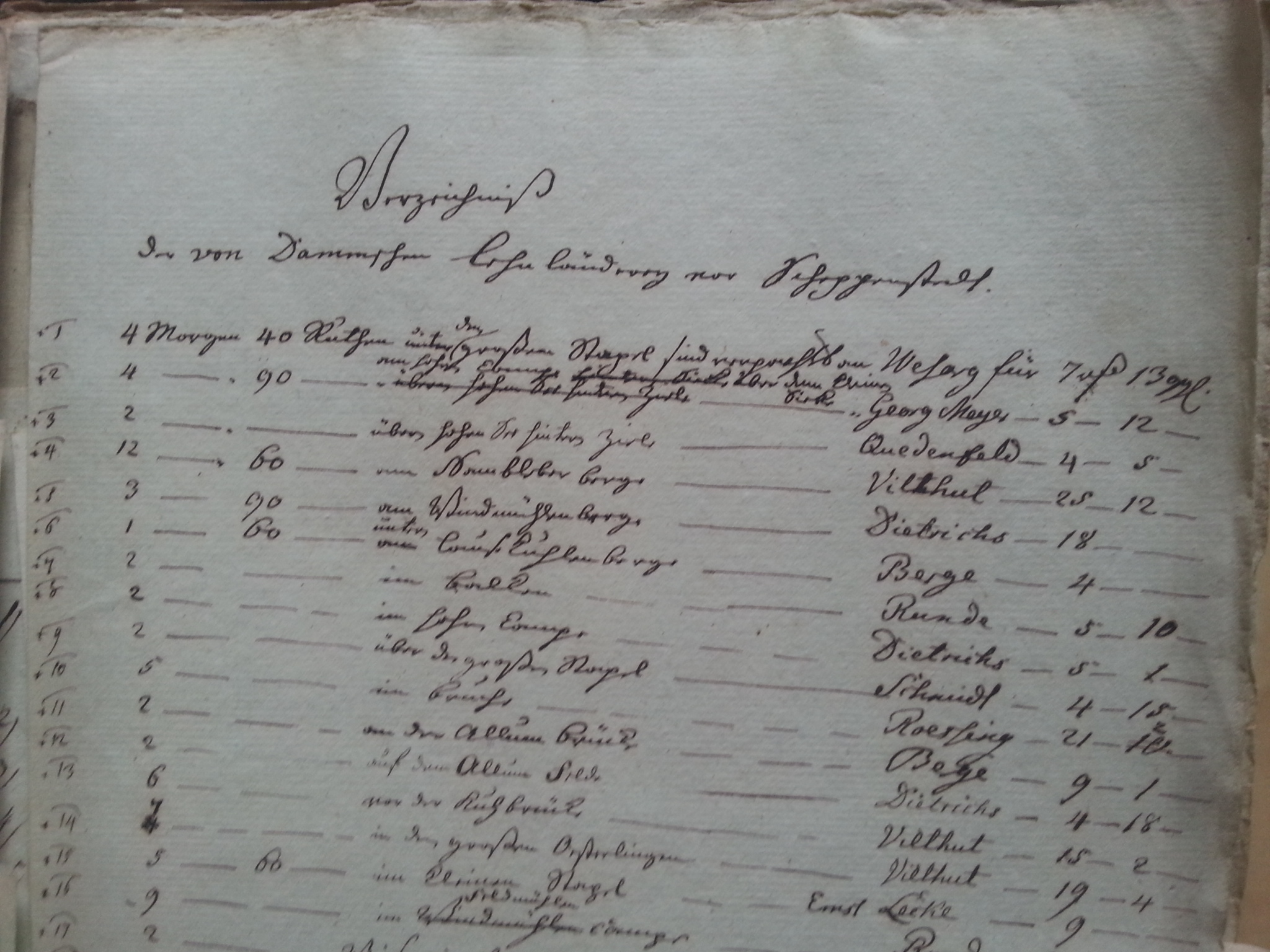 So hat Herr Dietrichs auf Position eine Fläche von 3 Morgen, 90 Ruthen am Windmühlenberg unter seiner Hacke und muß dafür 18 Thaler im Jahr bezahlen. Der Gute nannte auch noch Position 8 und 12 sein Eigen. 8) kann ich nicht entziffern, aber 12) 2 Morgen auf dem alten Felde für 4 Thaler und 18 gute Groschen. Und Herr von Damm hat ohne viel Zutun jährlich 256 Thaler und 14 gute Groschen eingestrichen.