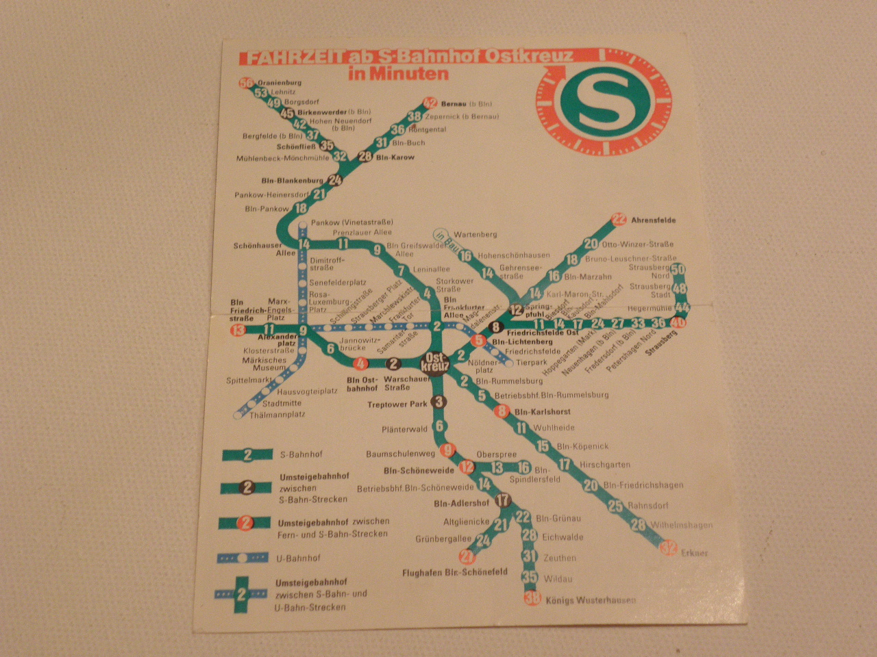 Das Innere des Kalenders zeigt nicht nur die Übersichtlichkeit der damaligen S-Bahn-Strecken, sondern auch die Fahrzeit vom Bahnhof Ostkreuz, dem damaligen Zentrum der Berliner S-Bahn. Man kann auch noch den verbliebenen Teil des S-Bahn-Stadtrings erkennen. Das Ost-Viertel verlief zwischen der Schönhauser Allee (links oben am scharfen Knick) bis zum Treptower Park (unter Ostkreuz). Inzwischen ist der Ring wieder rund und man kann immer im Kreis fahren (linksrum oder rechtsrum).
