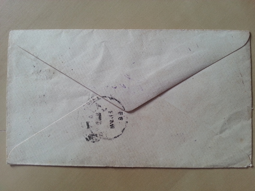 Patiala ist eine doch recht große Stadt im Nordwesten Indiens. Dieser wiederum recht kleine Brief (ca. 15 x 6 cm) wurde am 15. Mai 1893 abgeschickt. Glücklicherweise steht in rot „Patiala“ drauf. Den Rest der Aufschrift kann ich nicht einmal einer Sprache zuordnen. Am nächsten kommt da für mein unwissendes Auge Arabisch. Die Provinz ist nicht allzu weit von Afghanistan entfernt. Wird dort nicht arabisch gesprochen? Wer weiß, was auf dem Kuvert steht…