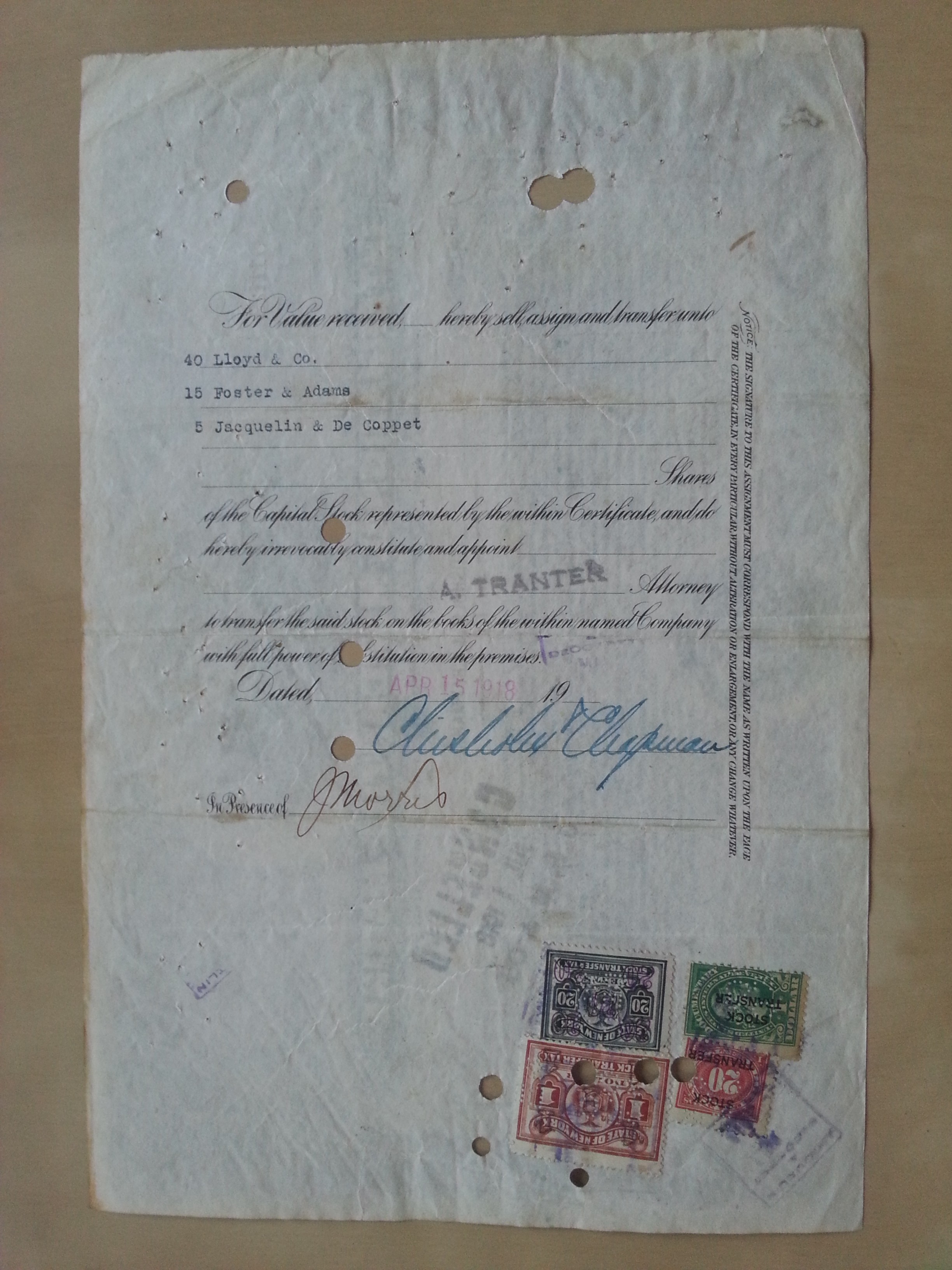 Eine sehr umfangreiche Seite mit detaillierter Beschreibung gibt es hier. Hier habe ich gerade gelesen, daß meine Aktie zu den gefragteren gehört. Preferred anstatt nur Common und im frühen Design (mit der hübsch anzuschauenden Dame am unteren Rand). Meine Aktie hat das Glück, nicht mit einer Lochung durch das Schiffsbild entwertet zu sein und wurde 1918 „cancelled“ wie man am Stempel sehen kann. Das ist insofern interessant, weil die Firma schon seit 1915 in Konkurs war, sich laut Wikipedia aber durch die gestiegene Nachfrage nach Schiffen im Ersten Weltkrieg wieder fangen konnte.