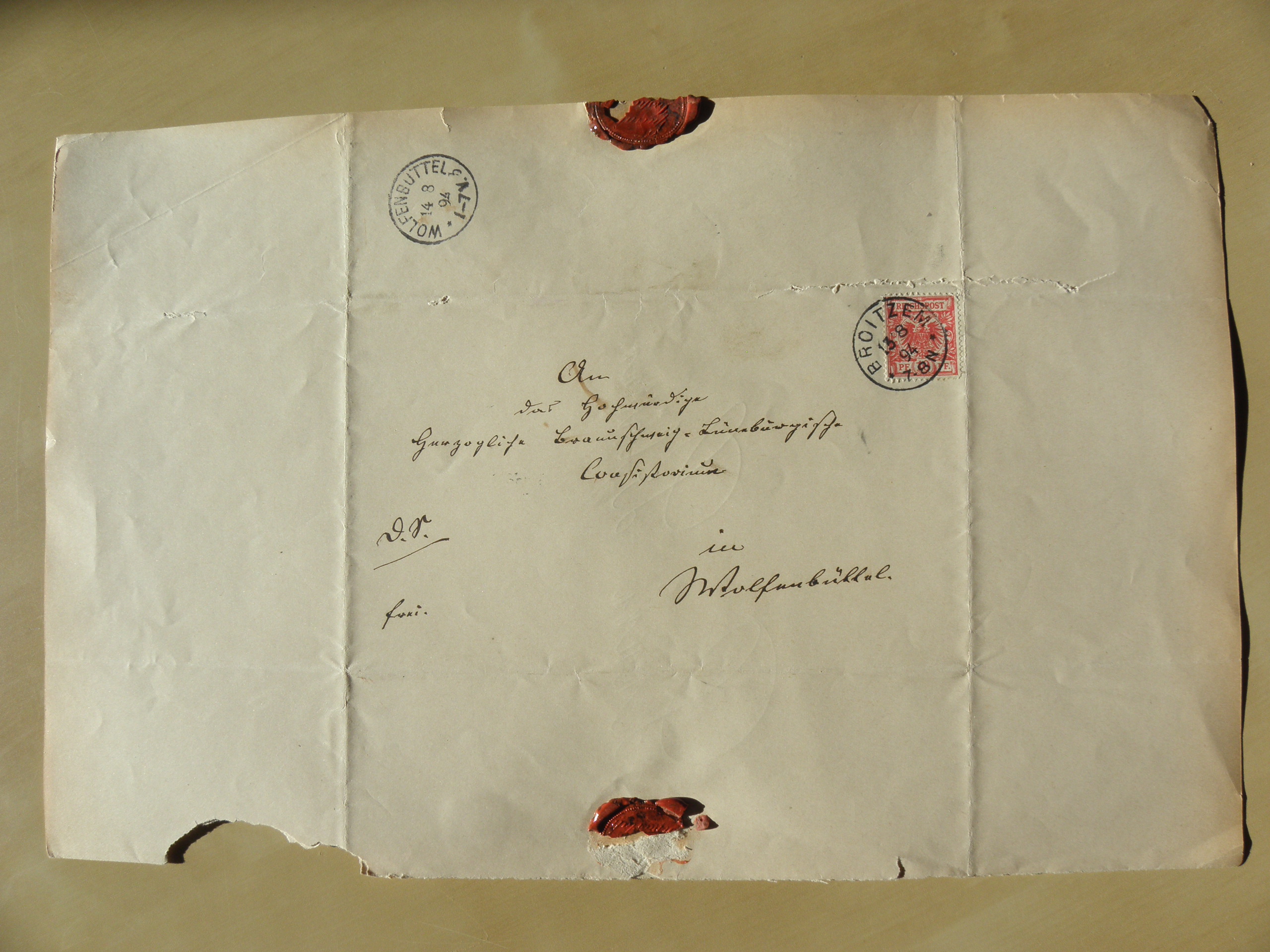 An das Hochwürdige Herzogliche Braunschweig-Lüneburgische Consistorium in Wolfenbüttel. (abgeschickt in Broitzem am 13.8.94 um 7-8 Uhr Nachmittags; angekommen in Wolfenbüttel am 14.8.94 um 1-7 Uhr Vormittags)