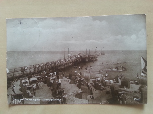 Endlich denkt Deine treulose Schwester mal an Dich. Es ist aber auch zu schade, daß Du nicht mit hier bist. Es ist herrlich hier. Wie sind denn die Autofahrten? Fährst Du immer mit? Wie war’s denn in F'(riedrich)roda? Mausi u. ich sind schon tüchtig braun. Mausi schwimmt seit heute mit dem großen Ball. Bisher ging sie immer nur bis zum Gürtel rein. Das Wasser ist herrlich. So warm, bloß sind so selten mal Wellen. So wie auf der Karte ist’s meistens. Jetzt ist leider kein Platz mehr. Also Schluß! Viele herzliche Grüße, Deine Elfriede!