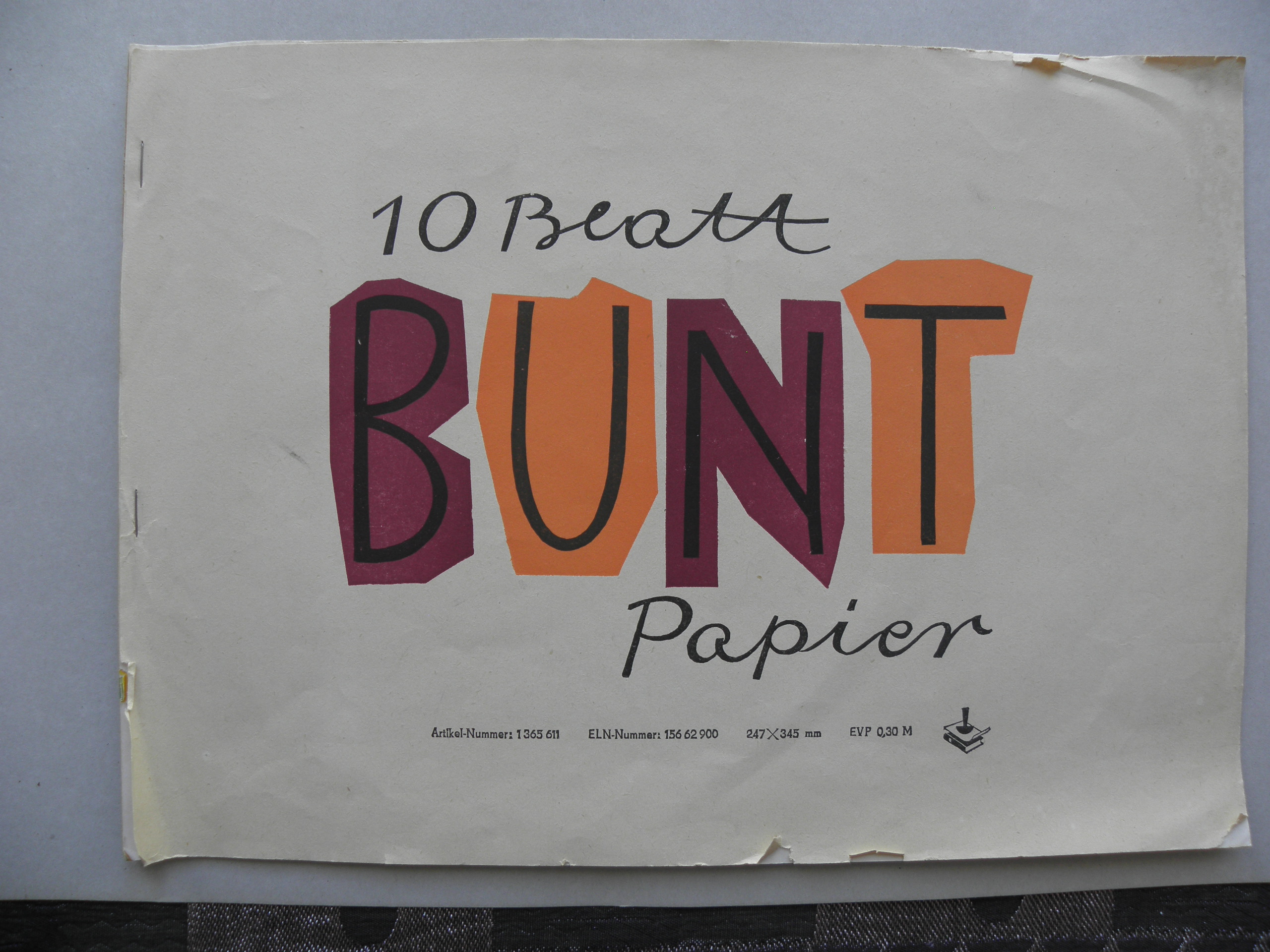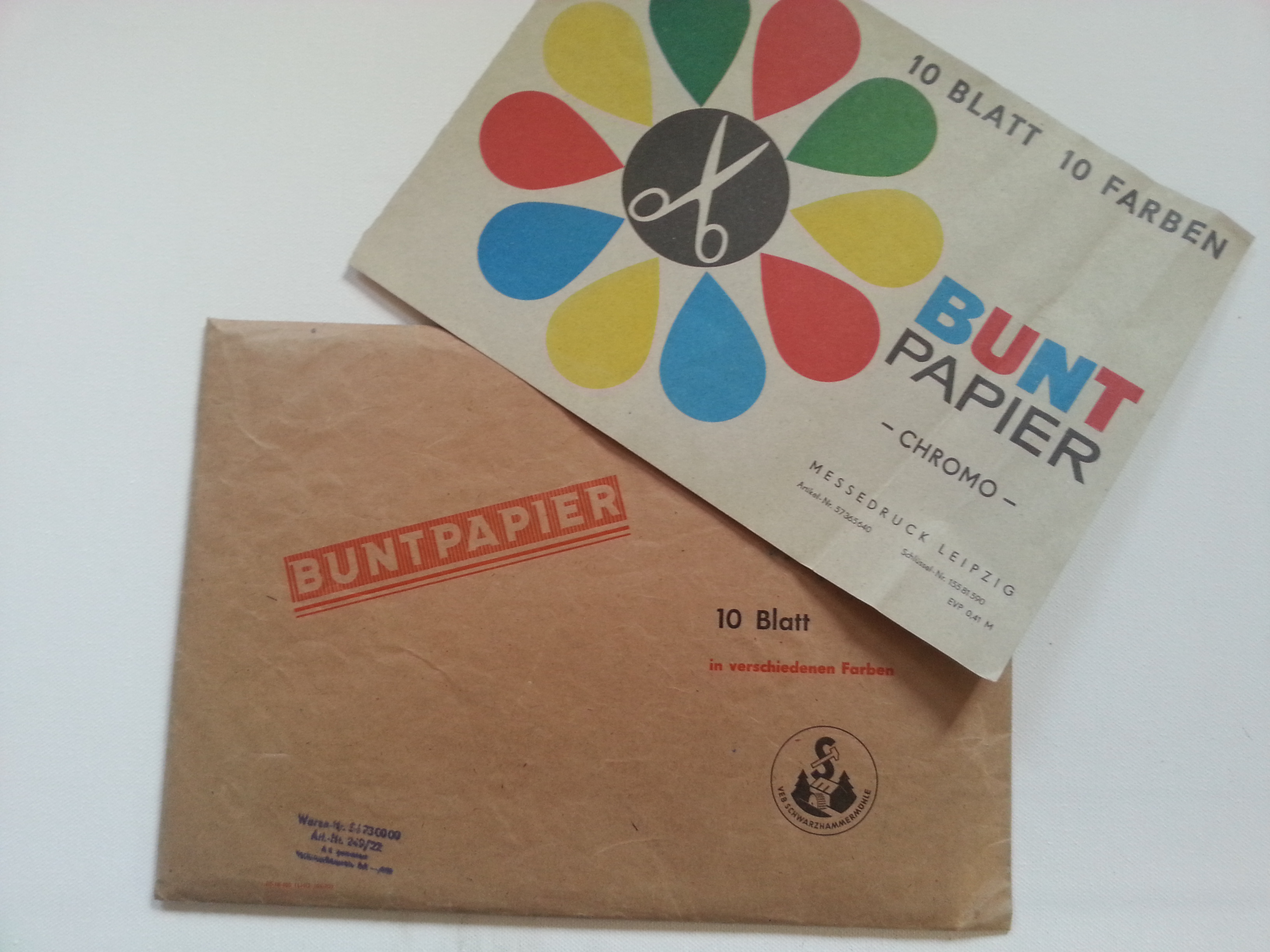 Heute habe ich für euch ein Relikt aus meiner Kindheit rausgesucht. Jedes DDR-Kind dürfte diesen Buntpapierblock kennen. Den gab es in klein (DIN A5) aber auch in DIN A4-Größe. Kosten: 41 DDR-Pfennige für 10 Blatt in 10 Farben, hergestellt vom Messedruck Leipzig.