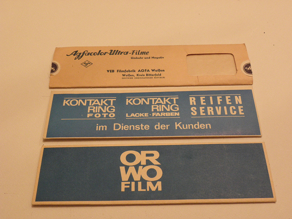 War der Film dann aber erstmal entwickelt, bekam man ihn in solch hübschen Filmtaschen ausgeliefert. Die Filme waren in Abschnitte von 5 oder 6 Bilder geteilt und steckten in Pergamin-Hüllen. Diese drei Hüllen stammen aus den 1950er/70er und 80er Jahren. Bis 1964 hieß das Filmwerk in Wolfen (Bitterfeld) noch AGFA, danach wurde daraus ORWO (ORiginal WOlfen). ORiginal BItterfeld wäre auch schön gewesen. Das hätte Gratiswerbung vom Papst an Ostern gegeben.