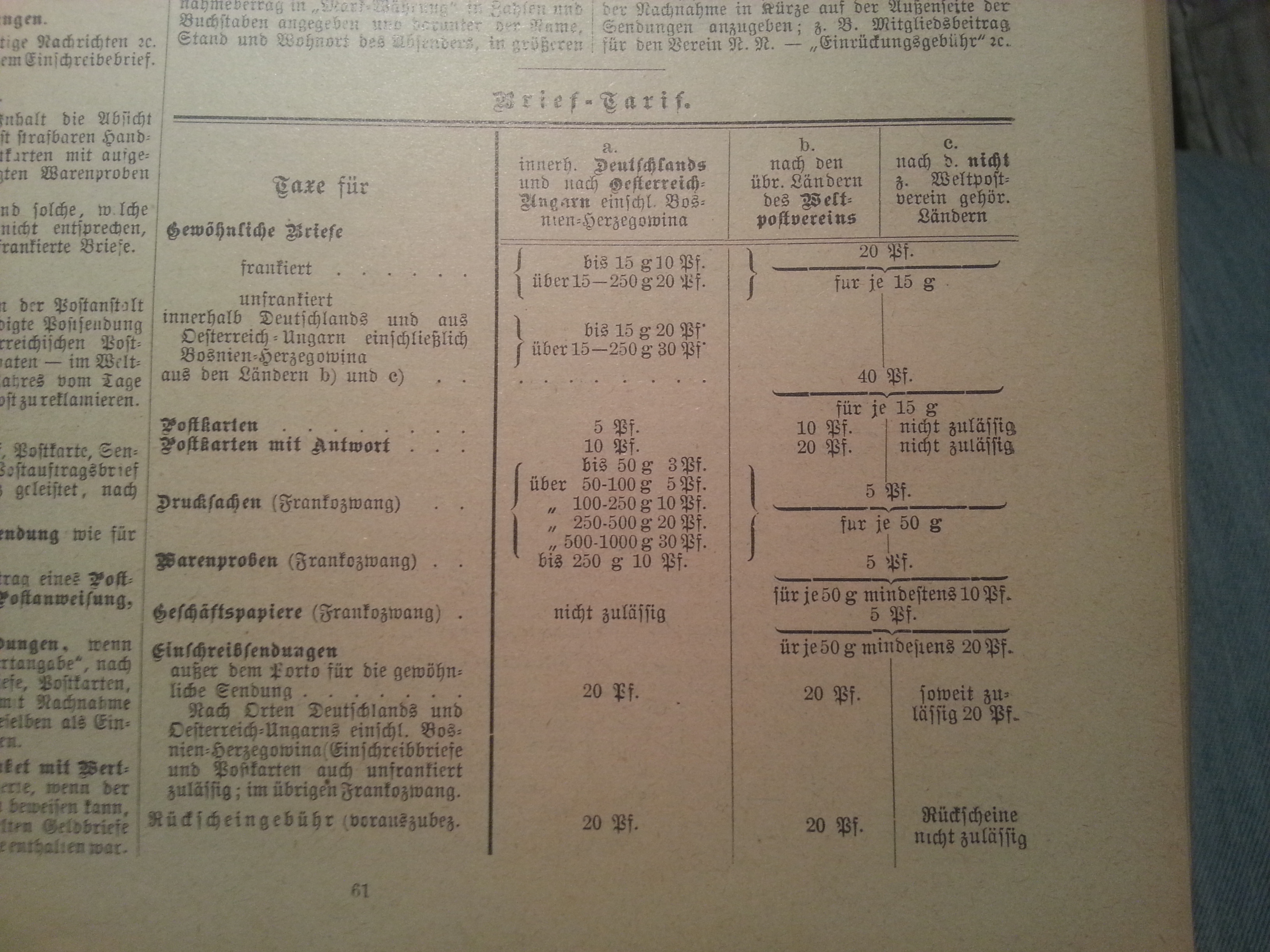 Paket-Tarife nach dem Auslande: Canada über Hamburg, RM 3,20 pro Kilo, über Belgien sogar 3,40. In die deutschen Kolonien 3,20 für 5 kg – vergleichsweise ein Schnäppchen. Und nach Deutsch-Togo (Klein-Popo oder Loma) sogar nur 1,60 für 5 kg. Persien muß mit 6,80 für 3 kg natürlich wieder über die Stränge schlagen.