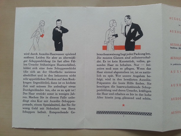 AUXOLIN – eine Marke der Firma F. WOLFF & SOHN, Karlsruhe. Weder die Marke, noch die Firma gibt es meines Wissens heute noch. Herr Wolff und seine Buben waren die Erfinder und Hersteller all der großartigen Produkte, die ihr oben links auf der Rückseite des Prospekts sehen könnt.