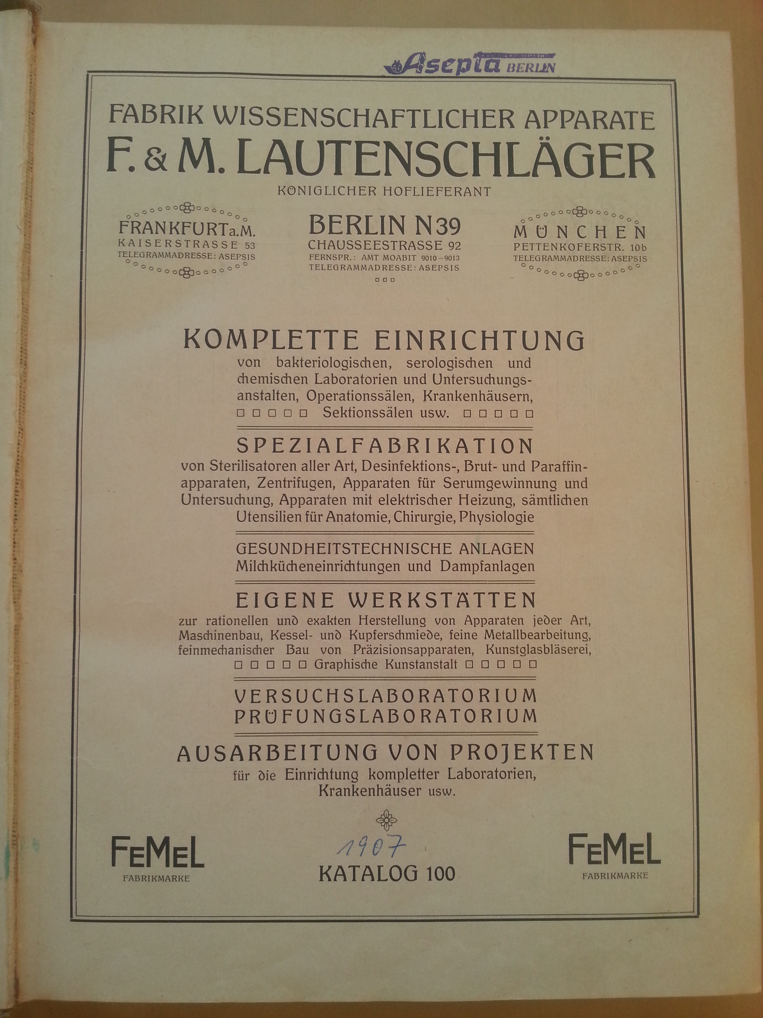 Die Firma F. & M. Lautenschläger gibt es noch heute. Sie ist zwar kein Königlicher Hoflieferant mehr und sitzt weder in Berlin N 39, noch in Frankfurt/M oder Muenchen, sondern in Köln, aber noch heute ist sie, wie eh und je, ein Produzent für Produkte, die in der Medizin und anderen Orten mit hohen Saubereitsanforderungen, ihren Einsatz finden.