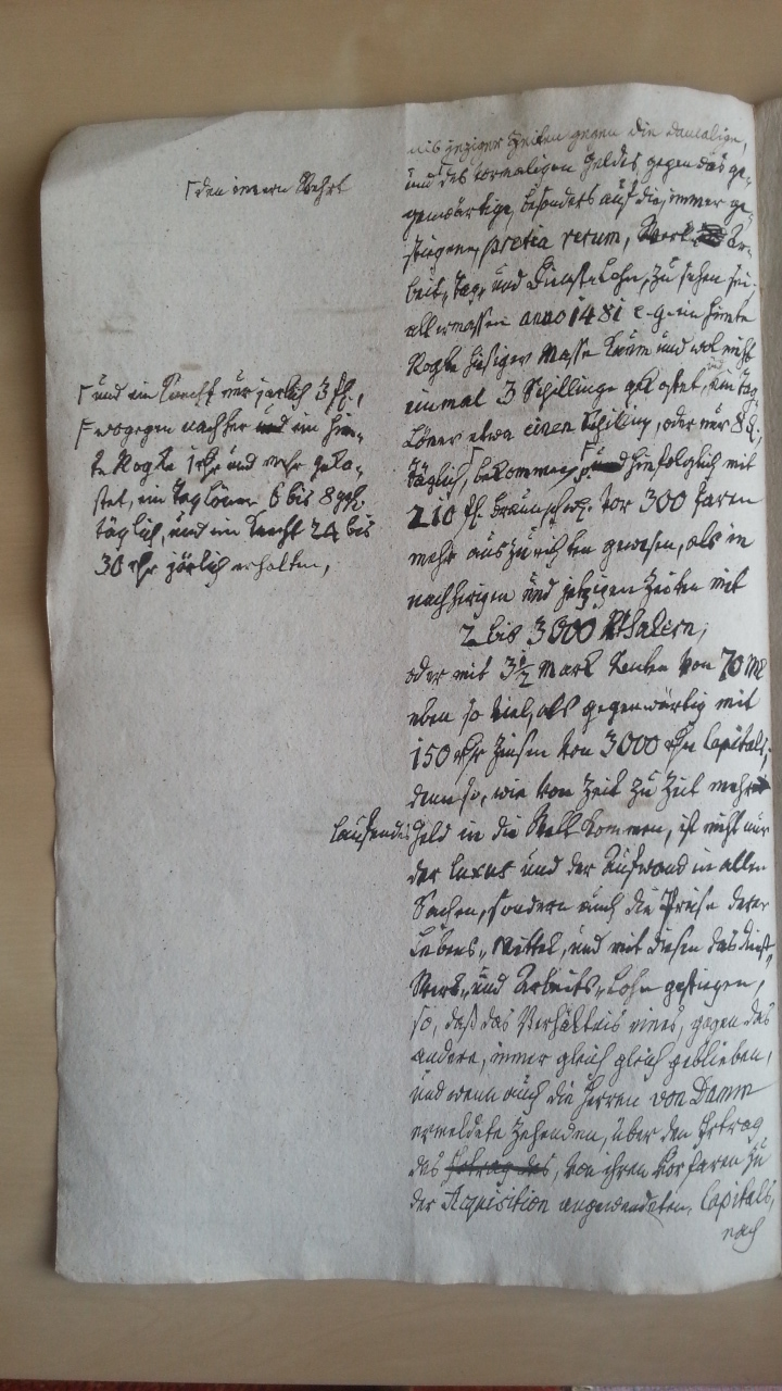 Von anderer Hand geschrieben gibt es noch eine Aufrechnung, „des vormaligen Geldes gegen das gegenwärtige, besonders auf die, immer gestiegenen pretia rerum, Werk-, Arbeit-, Tag- und Dienst-Lohn, zu sehen sei. allermassen anno 1481 … ein hiesiger Masse-Löner … wohl nicht einmal 3 Schillinge gehabet und ein Tag-Löner etwa einen Schilling oder nur 8 Pfennige täglich bekommen. Hiefolglich mit 210 Gulden Braunschw. vor 300 Jahren mehr auszurichten gewesen als in nachherigen und jetzigen Zeiten mit 2 bis 3000 Thalern.“
