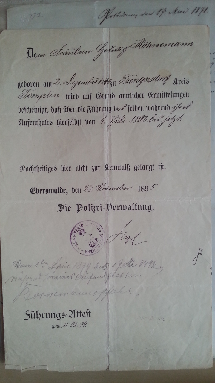 geboren am 2. Dezember 1868 zu Tangersdorf Kreis Templin wird auf Grund amtlicher Ermittelungen bescheinigt, daß über die Führung derselben während ihres Aufenthalts hierselbst von 1. Juli 1892 bis jetzt Nachtheiliges nicht zur Kenntniß gelangt ist.